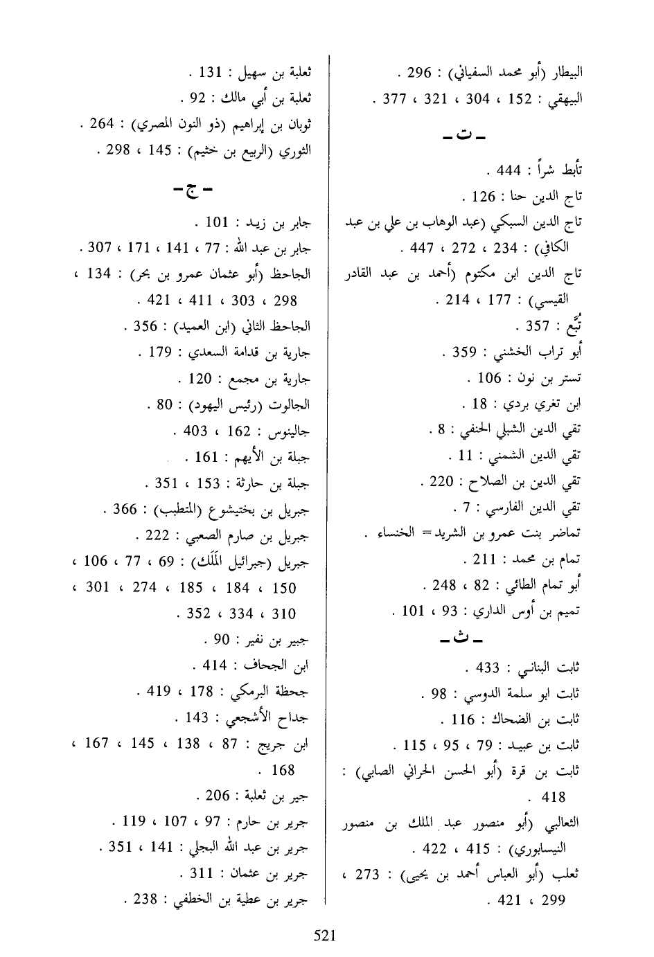 ثعلب (أبو العباس أحمد بن يحيى) : 273، 299، 421.
