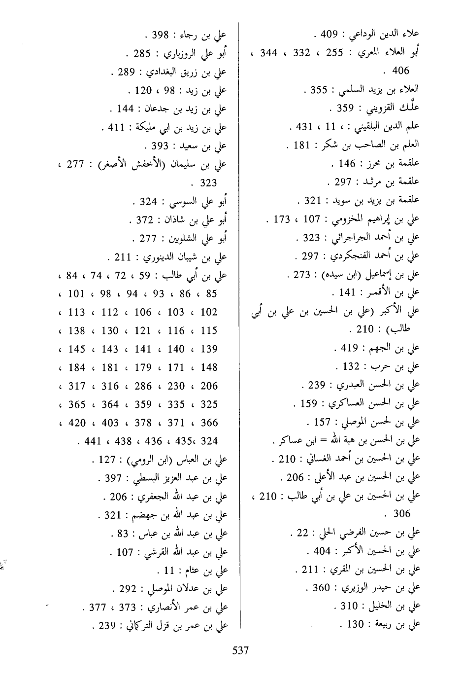 علي بن أبي طالب: 59، 72، 74، 84، 85، 86، 93، 94، 98، 101، 102، 103، 106، 112، 113، 115، 116، 121، 130، 138، 139، 140، 141، 143، 145، 148، 171، 179، 181، 184، 206، 230، 286، 316، 317، 325، 335، 359، 364، 365، 366، 371، 378، 403، 420، 324، 435، 436، 438، 441.