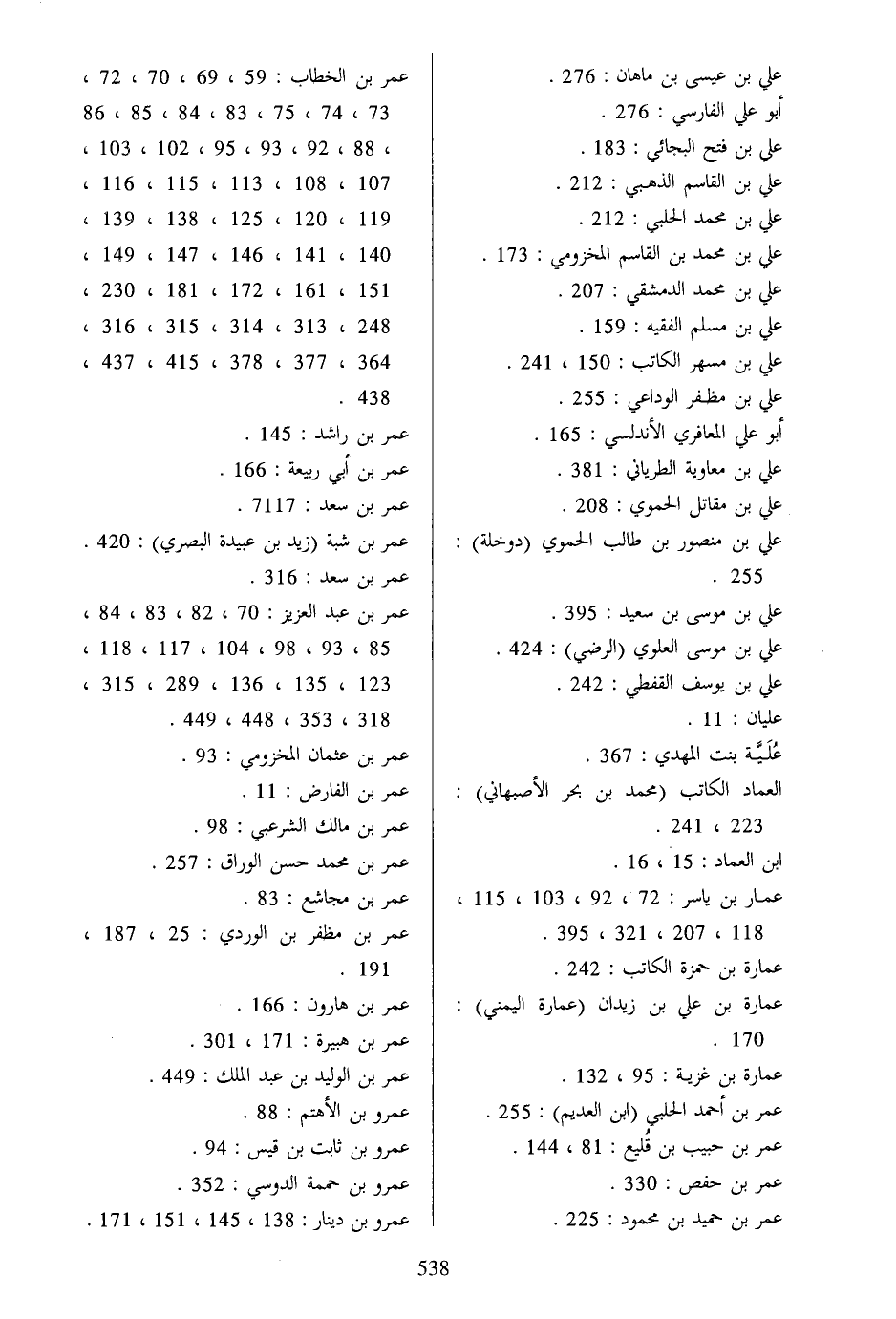 عمر بن الخطاب: 59، 69، 70، 72، 73، 74، 75، 83، 84، 85، 86، 88، 92، 93، 95، 102، 103، 107، 108، 113، 115، 116، 119، 120، 125، 138، 139، 140، 141، 146، 147، 149، 151، 161، 172، 181، 230، 248، 313، 314، 315، 316، 364، 377، 378، 415، 437، 438.