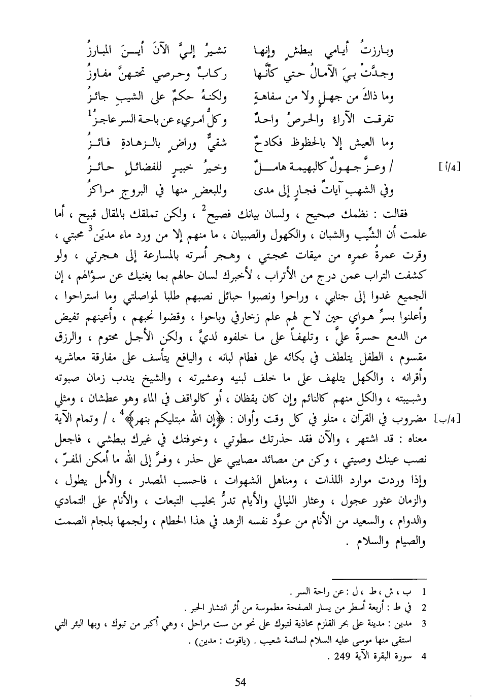 [4] ،/وتمام الآية معناه: قد اشتهر، والآن فقد حذرتك سطوتي، وخوفتك في غيرك ببطشي، فاجعل نصب عينك وصيتي، وكن من مصائد مصايبي على حذر، وفرّ إلى الله ما أمكن المفرّ، وإذا وردت موارد اللذات، ومناهل الشهوات، فاحسب المصدر، والأمل يطول، والزمان عثور عجول، وعثار الليالي والأيام تدرّ بحليب التبعات، والأنام على التمادي والدوام، والسعيد من الأنام من عوّد نفسه الزهد في هذا الحطام، ولجمها بلجام الصمت والصيام والسلام.