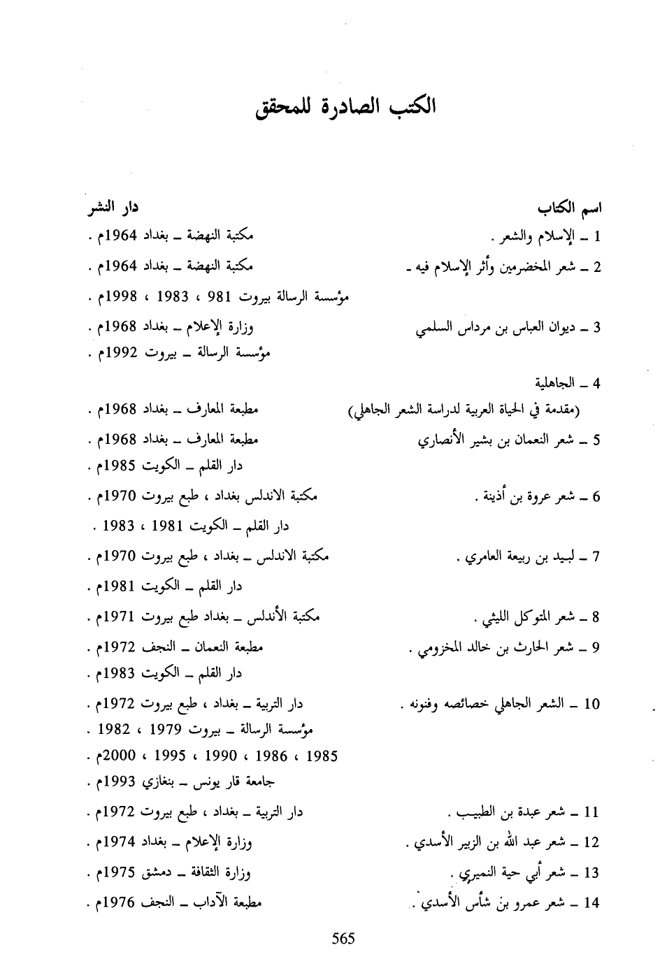 10- الشعر الجاهلي خصائصه وفنونه. دار التربية- بغداد، طبع بيروت 1972 م.