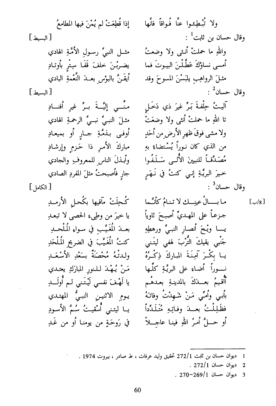 [1] ديوان حسان بن ثابت 1/272 تحقيق وليد عرفات، ط صادر، بيروت 1974.