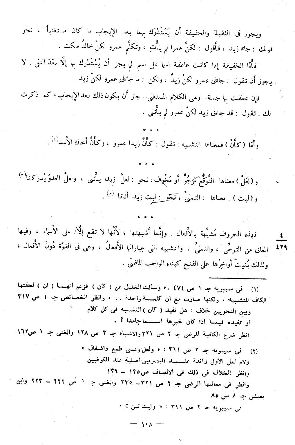فَهَذِهِ الْحُرُوف مشبهة بالأفعال وَإِنَّمَا أشبهتها لِأَنَّهَا لَا تقع إِلَّا على الْأَسْمَاء وفيهَا الْمعَانِي من الترجي وَالتَّمَنِّي والتشبيه الَّتِي عباراتها الْأَفْعَال وَهِي فِي الْقُوَّة دون الْأَفْعَال وَلذَلِك بنيت أواخرها على الْفَتْح كبناء الْوَاجِب الْمَاضِي