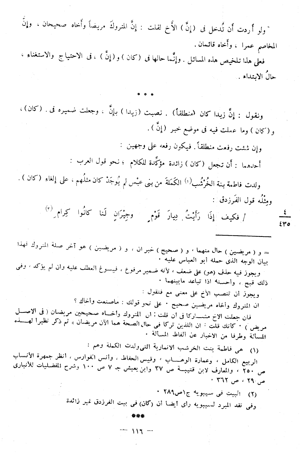 ولدت فَاطِمَة بنت الخرشب الكملة من بني عبس لم يُوجد كَانَ مثلهم على إِلْغَاء كَانَ وَمثله قَول الفرزدق