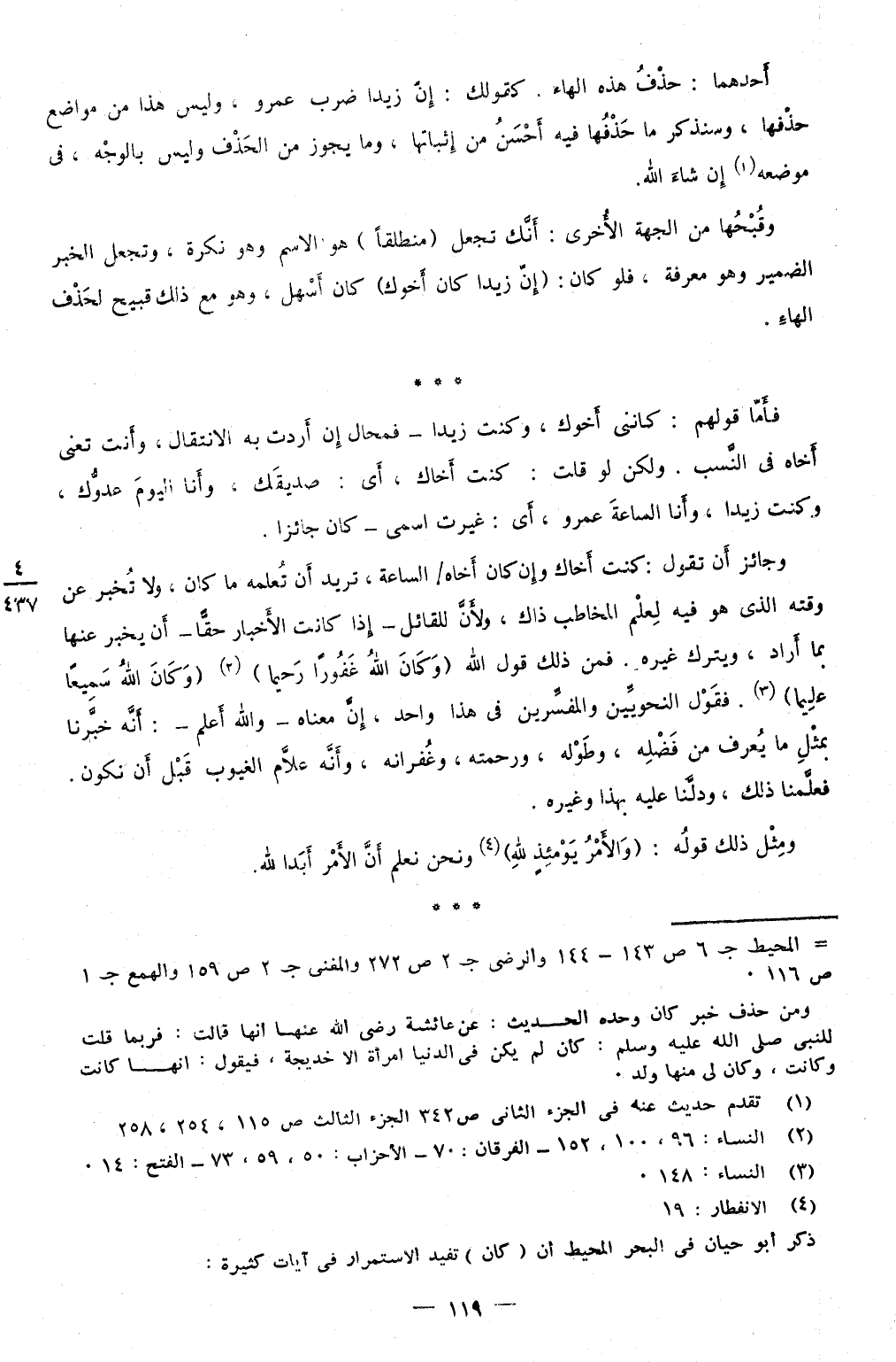 وَجَائِز أَن تَقول كنت أَخَاك وَإِن كَانَ أَخَاهُ السَّاعَة تُرِيدُ أَن تعلمه مَا كَانَ وَلَا تخبر عَن وقته الَّذِي هُوَ فِيهِ لعلم الْمُخَاطب ذَاك وَلِأَن للْقَاتِل إِذا كَانَت الْأَخْبَار حَقًا أَن يخبر عَنْهَا بِمَا أَرَادَ وَيتْرك غَيره فَمن ذَلِك قَول الله {وَكَانَ الله غَفُورًا رحِيما} {وَكَانَ الله سميعا عليما} فَقَوْل النَّحْوِيين والمفسرين فِي هَذَا وَاحِد إِن مَعْنَاهُ وَالله أعلم أَنه خبرنَا بِمثل مَا يعرف من فَضله وَطوله وَرَحمته وغفرانه وَأَنه علام الغيوب قبل أَن نَكُون فَعلمنَا ذَلِك ودلنا عَلَيْهِ بِهَذَا وَغَيره