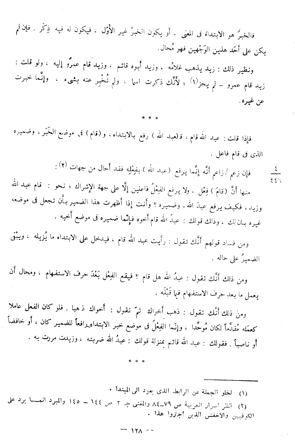 وَمن ذَلِك أَنَّك تَقول ذهب أَخَوَاك ثمَّ تَقول أَخَوَاك ذَهَبا فَلَو كَانَ الْفِعْل عَاملا كعمله مقدما لَكَانَ موحدا وَإِنَّمَا الْفِعْل فِي مَوضِع خبر الِابْتِدَاء رَافعا للضمير كَانَ أَو خَافِضًا أَو ناصبا فقولك عبد الله قَائِم بِمَنْزِلَة قَوْلك عبد الله ضَربته وزيدت مَرَرْت بِهِ
