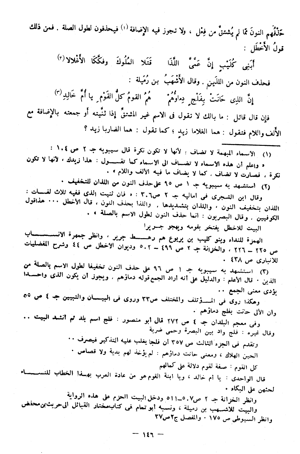 حذفهم النُّون مِمَّا لم يشتق من فعل وَلَا تجوز فِيهِ الْإِضَافَة فيحذفون لطول الصِّلَة فَمن ذَلِك قَول الأخطل