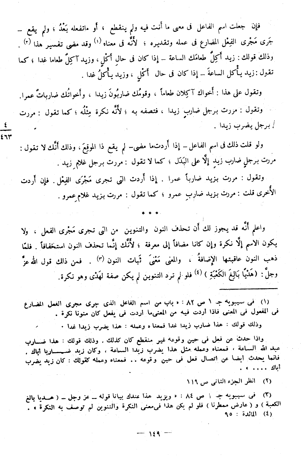 وَاعْلَم أَنه قد يجوز لَك أَن تحذف النُّون والتنوين من الَّتِي تجْرِي مجْرى الْفِعْل وَلَا يكون الِاسْم إِلَّا نكرَة وَإِن كَانَا مُضَافا إِلَى معرفَة لِأَنَّك إِنَّمَا تحذف النُّون اسْتِخْفَافًا فَلَمَّا ذهب النُّون عَاقبَتهَا الْإِضَافَة وَالْمعْنَى معنى ثبات النُّون فَمن ذَلِك قَول الله عز وَجل {هَديا بَالغ الْكَعْبَة} فَلَو لم ترد التَّنْوِين لم يكن صفة لهدي وَهُوَ نكرَة