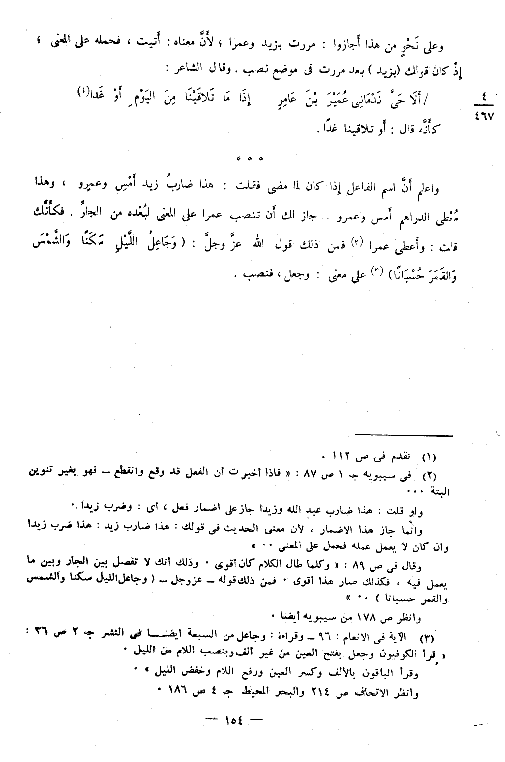 وَاعْلَم أَن اسْم الْفَاعِل إِذا كَانَ لما مضى فَقلت هَذَا ضَارب زيد أمس وَعَمْرو وَهَذَا معطي الدَّرَاهِم أمس وَعَمْرو جَازَ لَك أَن تنصب عمرا على الْمَعْنى لبعده من الْجَار فكأنك قلت وَأعْطى عمرا فَمن ذَلِك قَول الله عز وَجل {وجاعل اللَّيْل سكنا وَالشَّمْس وَالْقَمَر حسبانا} على معنى وَجعل فنصب