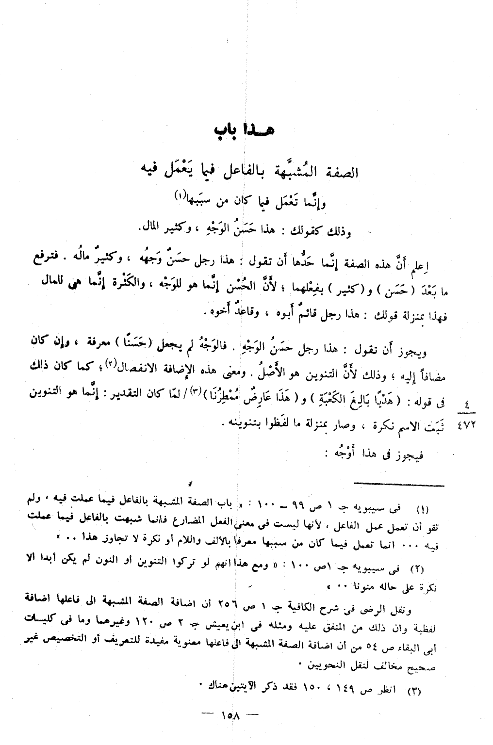 اعْلَم أَن هَذِه الصّفة إِنَّمَا حَدهَا أَن تَقول هَذَا رجل حسن وَجهه وَكثير مَاله فَترفع مَا بعد حسن وَكثير بفعلهما لِأَن الْحسن إِنَّمَا هُوَ للْوَجْه وَالْكَثْرَة إِنَّمَا هِيَ لِلْمَالِ فَهَذَا بِمَنْزِلَة قَوْلك هَذَا رجل قَائِم أَبوهُ وقاعد أَخُوهُ وَيجوز أَن تَقول هَذَا رجل حسن الْوَجْه فَالْوَجْه لم يَجْعَل حسنا معرفَة وَإِن كَانَ مُضَافا إِلَيْهِ وَذَلِكَ لِأَن التَّنْوِين هُوَ الأَصْل وَمعنى هَذِه الْإِضَافَة الِانْفِصَال كَمَا كَانَ ذَلِك فِي قَوْله {هَديا بَالغ الْكَعْبَة} و {هَذَا عَارض مُمْطِرنَا} لما كَانَ التَّقْدِير إِنَّمَا هُوَ التَّنْوِين ثَبت الِاسْم نكرَة وَصَارَ بِمَنْزِلَة مَا لَفَظُوا بتنوين