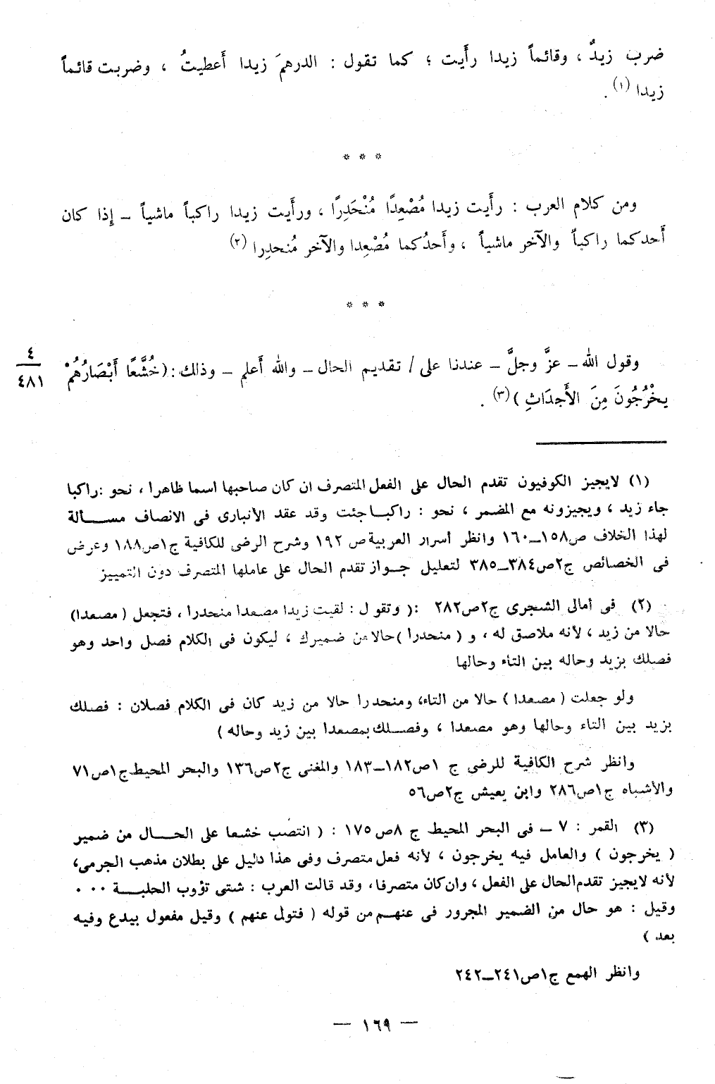 وَمن كَلَام الْعَرَب رَأَيْت زيدا مصعدا منحدرا وَرَأَيْت زيدا رَاكِبًا مَاشِيا إِذا كَانَ أَحَدكُمَا رَاكِبًا وَالْآخر مَاشِيا وأحدكما مصعدا وَالْآخر منحدرا