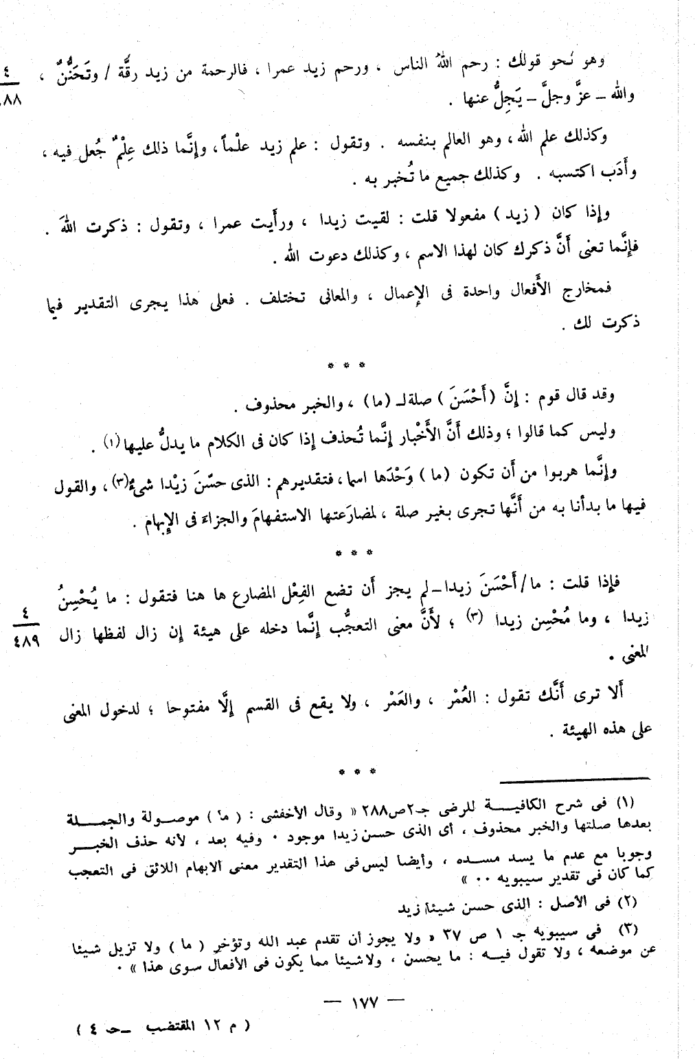 فَإِذا قلت مَا أحسن زيدا لم يجز أَن تضع الْفِعْل الْمُضَارع هَا هُنَا فَتَقول مَا يحسن زيدا وَمَا محسن زيدا لِأَن معنى التَّعَجُّب إِنَّمَا دخله على هَيْئَة إِن زَالَ لَفظهَا زَالَ الْمَعْنى