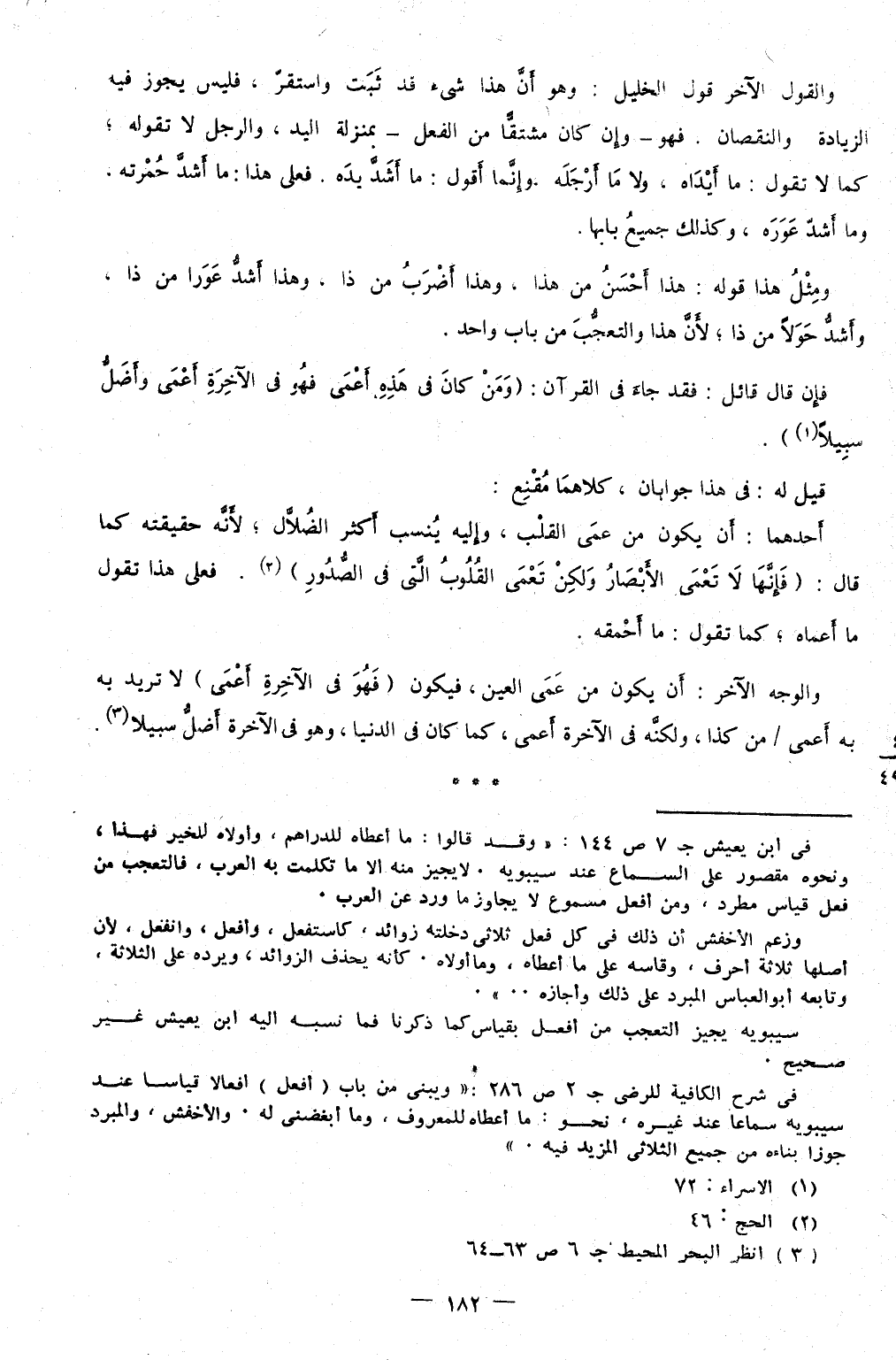 وَالْقَوْل الآخر قَول الْخَلِيل وَهُوَ أَن هَذَا شَيْء قد ثَبت وَاسْتقر فَلَيْسَ يجوز فِيهِ الزِّيَادَة وَالنُّقْصَان فَهُوَ وَإِن كَانَ مشتقاً من الْفِعْل بِمَنْزِلَة الْيَد وَالرجل لَا تَقوله كَمَا لَا تَقول مَا أيداه وَلَا مَا أرجله وَإِنَّمَا أَقُول مَا أَشد يَده فعلى هَذَا مَا أَشد حمرته وَمَا أَشد عوره وَكَذَلِكَ جَمِيع بَابهَا