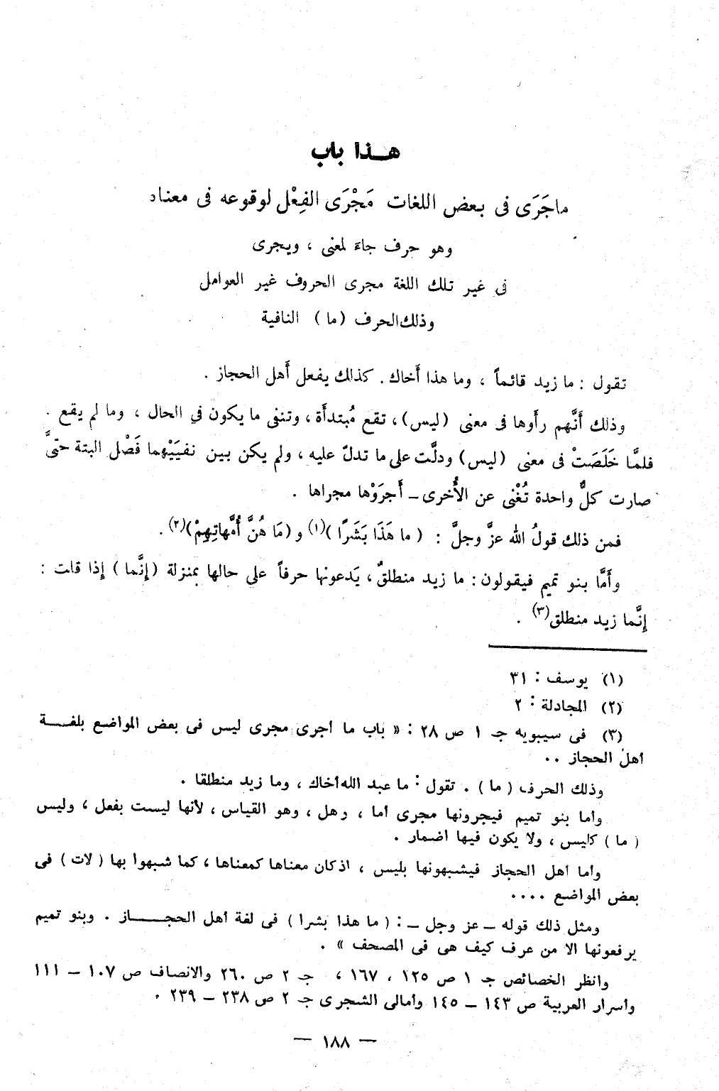 (هَذَا بَاب مَا جرى فِي بعض اللُّغَات مجْرى الْفِعْل لوُقُوعه فِي مَعْنَاهُ وَهُوَ حرف وَجَاء لِمَعْنى وَيجْرِي فِي غير تِلْكَ اللُّغَة مجْرى الْحُرُوف غير العوامل وَذَلِكَ الْحَرْف مَا النافية)