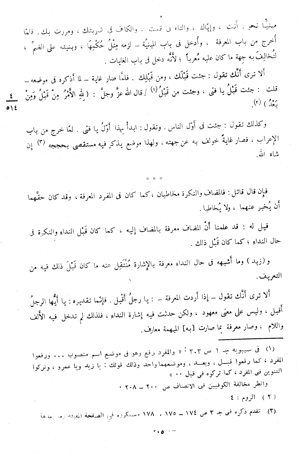 وَكَذَلِكَ تَقول جِئْت فِي أول النَّاس وَتقول ابدأ بِهَذَا أول يَا فَتى لما خرج من بَاب الْإِعْرَاب فَصَارَ غَايَة خُولِفَ بِهِ عَن جِهَته وَلِهَذَا مَوضِع يذكر فِيهِ مستقصى بحججه إِن شَاءَ الله