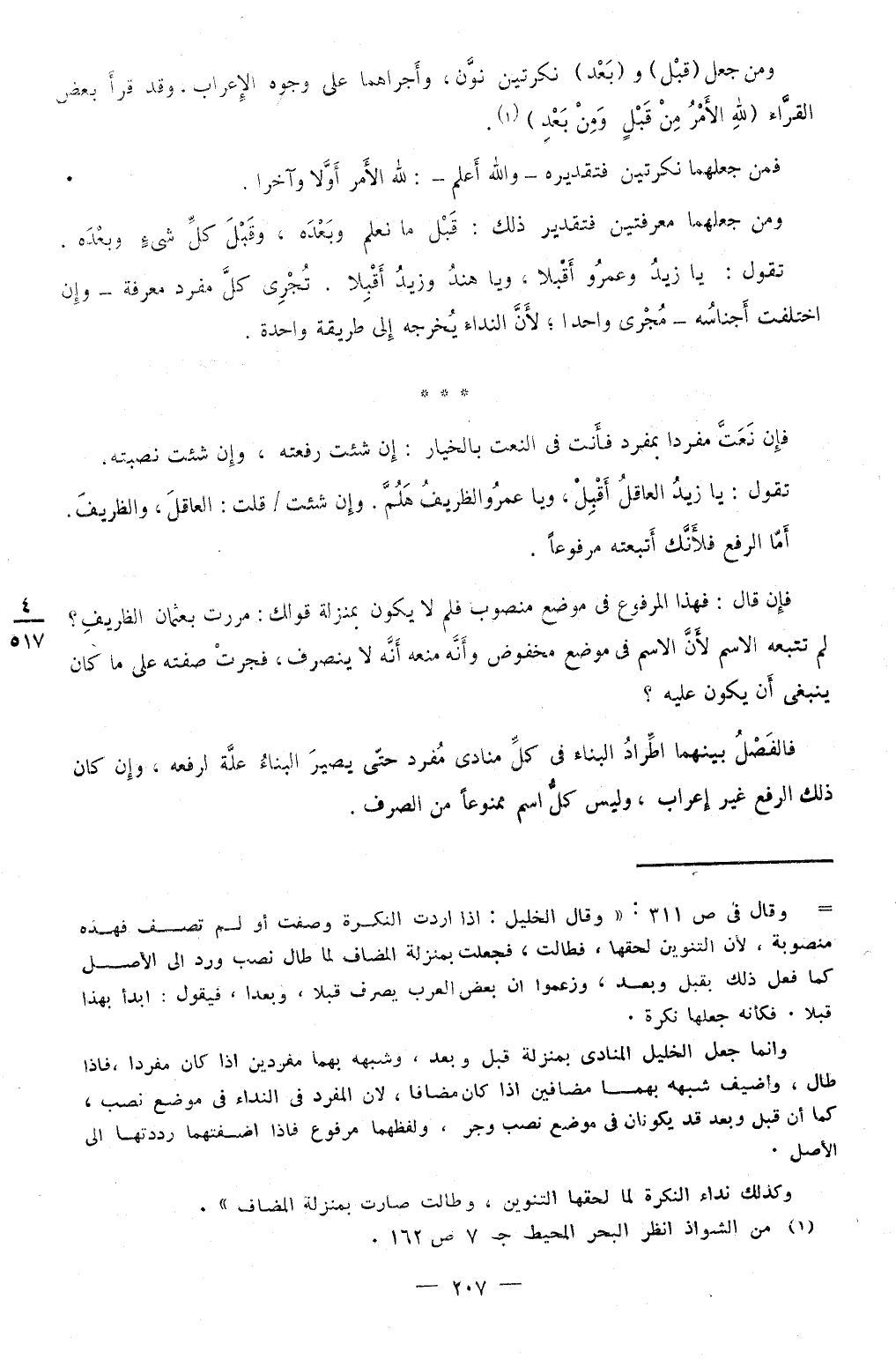وَمن جعل قبل وَبعد نكرتين نون وأجراهما على وُجُوه الْإِعْرَاب وَقد قَرَأَ بعض الْقُرَّاء {لله الْأَمر من قبل وَمن بعد}