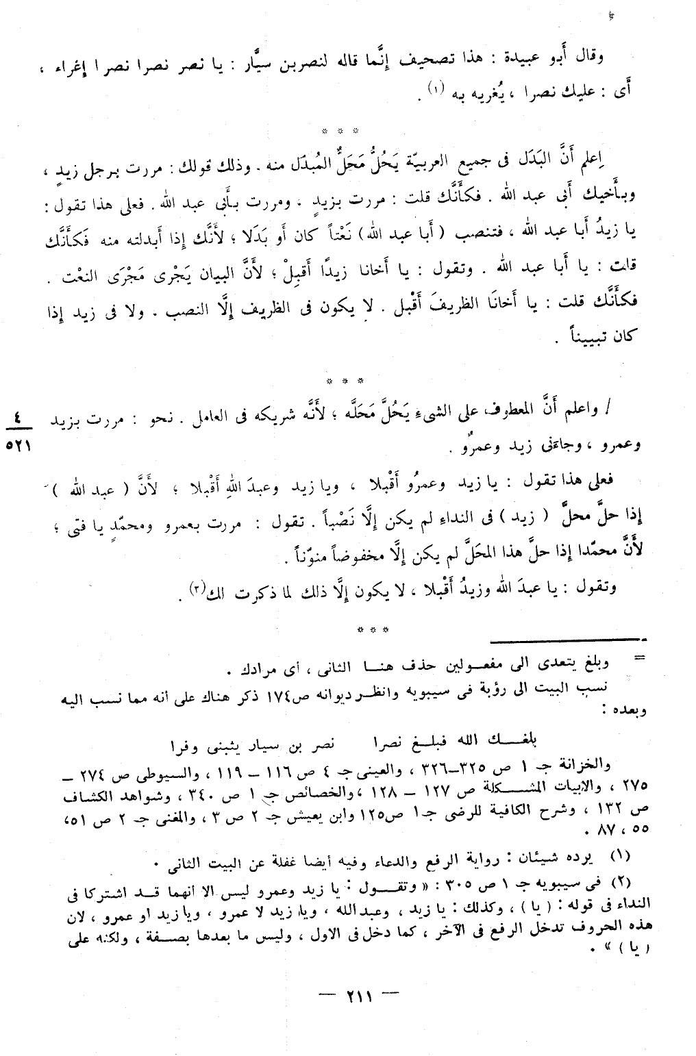 وَقَالَ أَبُو عُبَيْدَة هَذَا تَصْحِيف إِنَّمَا قَالَه لنصر بن سيار يَا نصر نصرا نصرا إغراء أَي عَلَيْك نصرا يغريه بِهِ اعْلَم أَن الْبَدَل فِي جَمِيع الْعَرَبيَّة يحل مَحل الْمُبدل مِنْهُ وَذَلِكَ قَوْلك مَرَرْت بِرَجُل زيد وبأخيك أبي عبد الله فكأنك قلت مَرَرْت بزيد ومررت بِأبي عبد الله فعلى هَذَا تَقول يَا زيد أَبَا عبد الله فتنصب أَبَا عبد الله نعتا كَانَ أَو بَدَلا لِأَنَّك إِذا أبدلته مِنْهُ فكأنك قلت يَا أَبَا عبد الله وَتقول يَا أخانا زيدا أقبل لِأَن الْبَيَان يجْرِي مجْرى النَّعْت فكأنك قلت يَا أخانا الظريف أقبل لَا يكون فِي الظريف إِلَّا النصب وَلَا فِي زيد إِذا كَانَ تبيينا
