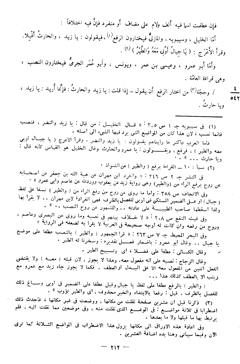 فَإِن عطفت اسْما فِيهِ ألف وَلَام على مُضَاف أَو مُنْفَرد فَإِن فِيهِ اخْتِلَافا أما الْخَلِيل وسيبويه والمازني فيختارون الرّفْع فَيَقُولُونَ يَا زيد والْحَارث أَقبلَا وَقَرَأَ الْأَعْرَج {يَا جبال أوبي مَعَه وَالطير}
