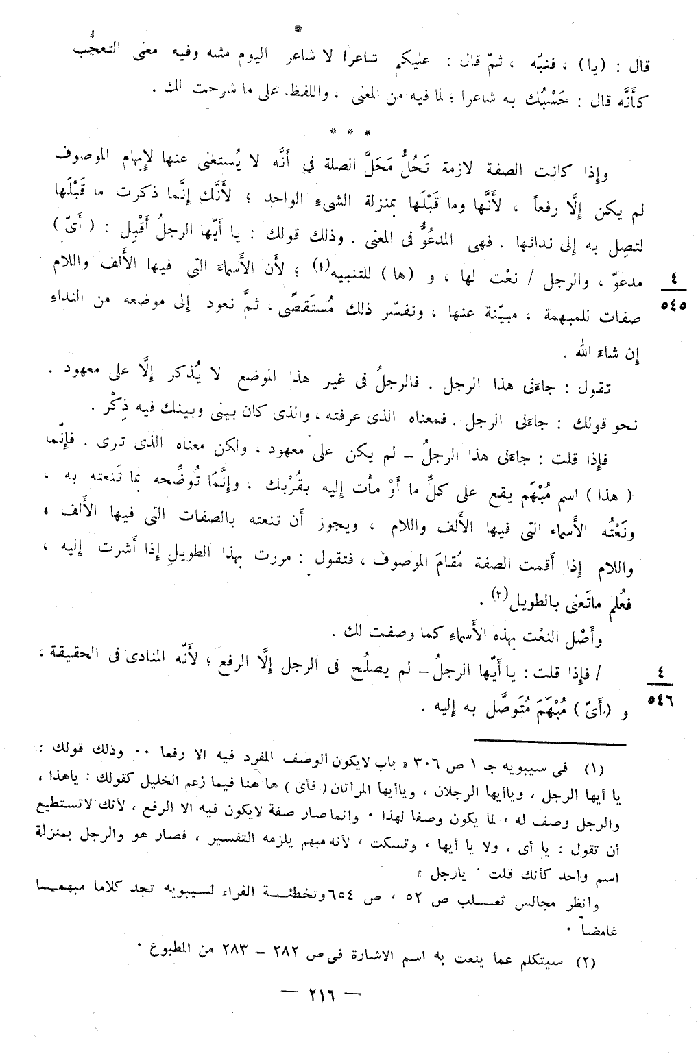 وَإِذا كَانَت الصّفة لَازِمَة تحل مَحل الصِّلَة فِي أَنه لَا يَسْتَغْنِي عَنْهَا لإبهام الْمَوْصُوف لم يكن إِلَّا رفعا لِأَنَّهَا وَمَا قبلهَا بِمَنْزِلَة الشَّيْء الْوَاحِد لِأَنَّك إِنَّمَا ذكرت مَا قبلهَا لتصل بِهِ إِلَى ندائها فَهِيَ الْمَدْعُو فِي الْمَعْنى وَذَلِكَ قَوْلك يَا أَيهَا الرجل أقبل أَي مدعُو وَالرجل نعت لَهَا وَهَا للتّنْبِيه لِأَن الْأَسْمَاء الَّتِي فِيهَا الْألف وَاللَّام صِفَات للمبهمة مبينَة عَنْهَا ونفسر ذَلِك مستقصي ثمَّ نعود إِلَى مَوْضِعه من النداء إِن شَاءَ الله