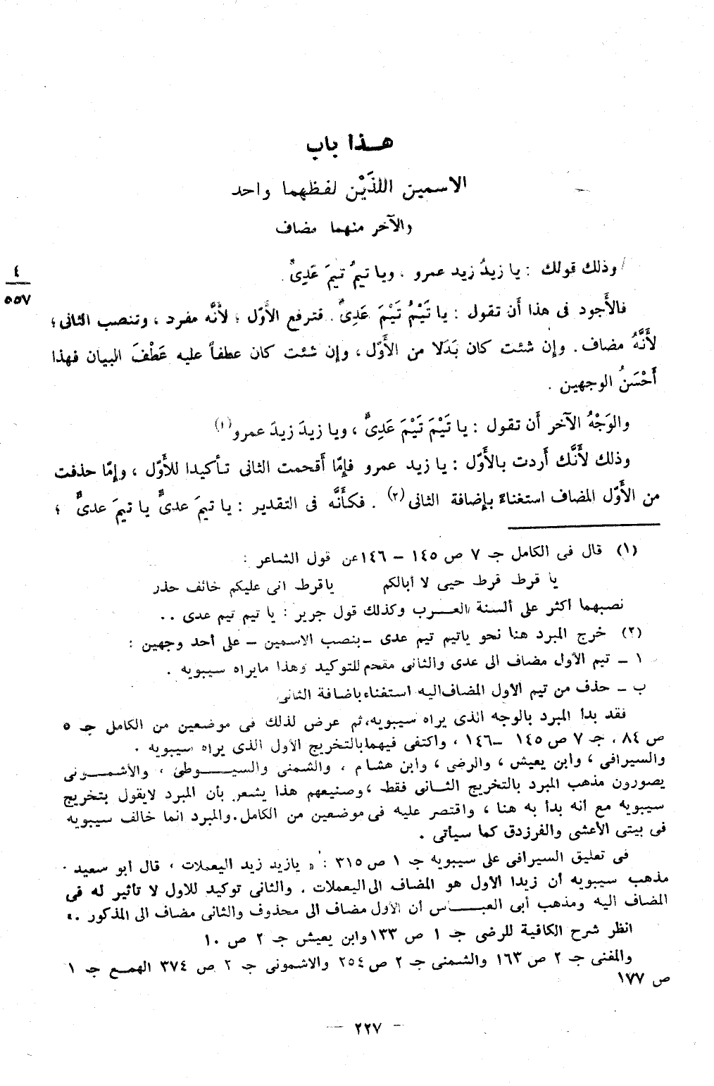 فالأجود فِي هَذَا أَن تَقول يَا تيم تيم عدي فَترفع الأول لِأَنَّهُ مُفْرد وتنصب الثَّانِي لِأَنَّهُ مُضَاف وَإِن شِئْت كَانَ بَدَلا من الأول وَإِن شِئْت كَانَ عطفا عَلَيْهِ عطف الْبَيَان فَهَذَا أحسن الْوَجْهَيْنِ