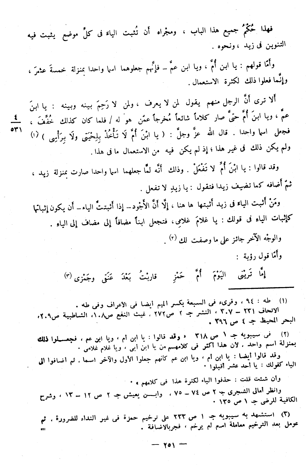 أَلا ترى أَن الرجل مِنْهُم يَقُول لمن لَا يعرف وَلمن لَا رحم بَينه وَبَينه يَا ابْن عَم وبا ابْن أم حَتَّى صَار كلَاما شَائِعا مخرجا عَمَّن هُوَ لَهُ فَلَمَّا كَانَ كَذَلِك خفف فَجعل اسْما وَاحِدًا قَالَ الله عز وَجل {يَا ابْن أم لَا تَأْخُذ بلحيتي وَلَا برأسي} وَلم يكن ذَلِك فِي غير هَذَا إِذْ لم يكن فِيهِ من الِاسْتِعْمَال مَا فِي هَذَا