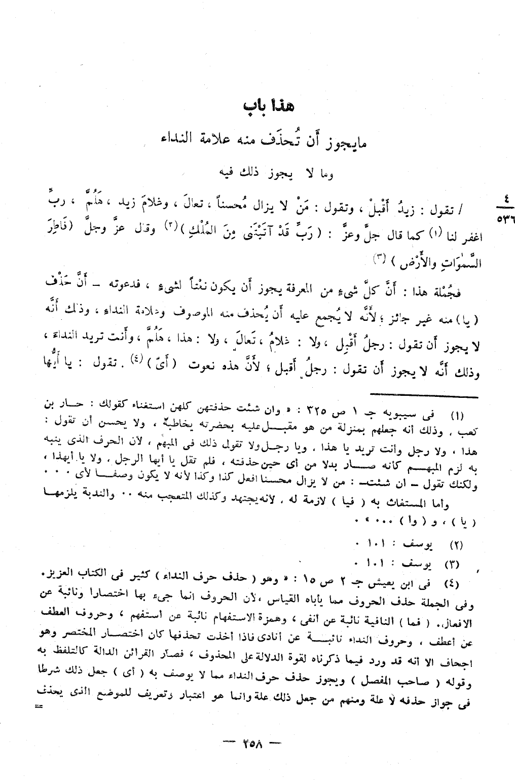 فجملة هَذَا أَن كل شَيْء من الْمعرفَة يجوز أَن يكون نعتا لشَيْء فدعوته أَن حذف يَا مِنْهُ غير جَائِز لِأَنَّهُ لَا يجمع عَلَيْهِ أَن يحذف مِنْهُ الْمَوْصُوف وعلامة النداء وَذَلِكَ أَنه لَا يجوز أَن تَقول رجل أقبل وَلَا غُلَام تعال وَلَا هَذَا هَلُمَّ وَأَنت تُرِيدُ النداء وَذَلِكَ أَنه لَا يجوز أَن تَقول رجل أقبل لِأَن هَذِه نعوت أَي تَقول يَا أَيهَا