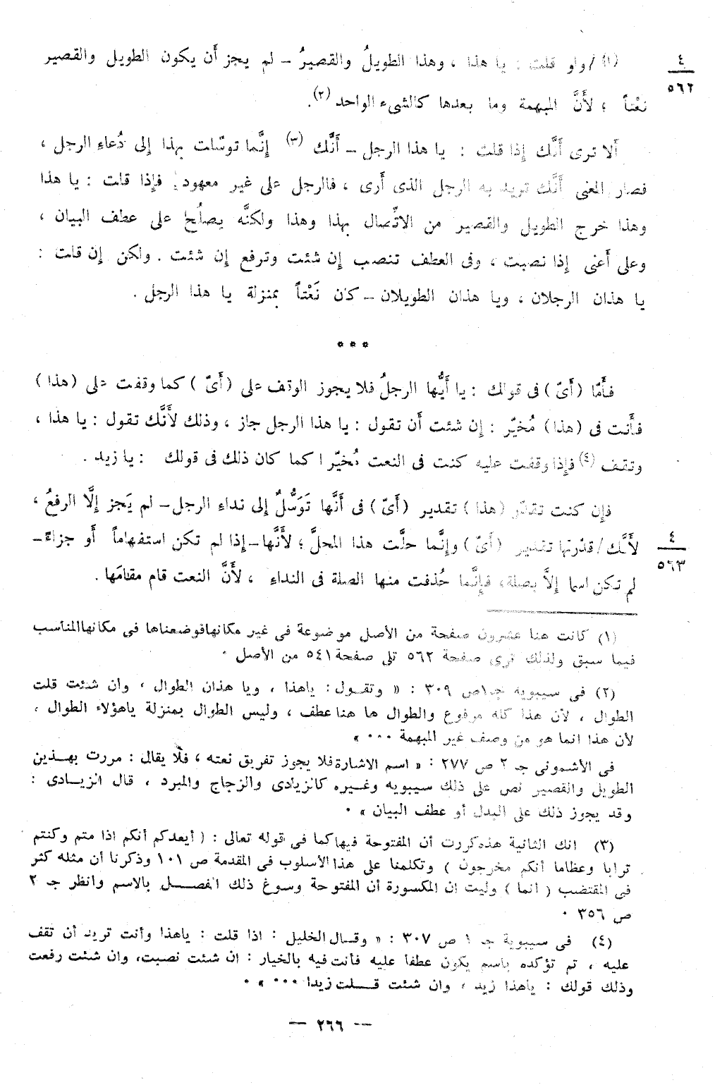 أَلا ترى أَنَّك إِذا قلت يَا هَذَا الرجل أَنَّك إِنَّمَا توسلت بِهَذَا إِلَى دُعَاء الرجل فَصَارَ الْمَعْنى أَنَّك تُرِيدُ بِهِ الرجل الَّذِي أرى فالرجل على غير مَعْهُود فَإِذا قلت يَا هَذَا وَهَذَا خرج الطَّوِيل والقصير من الِاتِّصَال بِهَذَا وَهَذَا وَلكنه يصلح على عطف الْبَيَان وعَلى أعنى إِذا نصبت وَفِي الْعَطف تنصب إِن شِئْت وترفع إِن شِئْت وَلَكِن إِن قلت يَا هَذَانِ الرّجلَانِ وَيَا هَذَانِ الطويلان كَانَ نعتا بِمَنْزِلَة يَا هَذَا الرجل