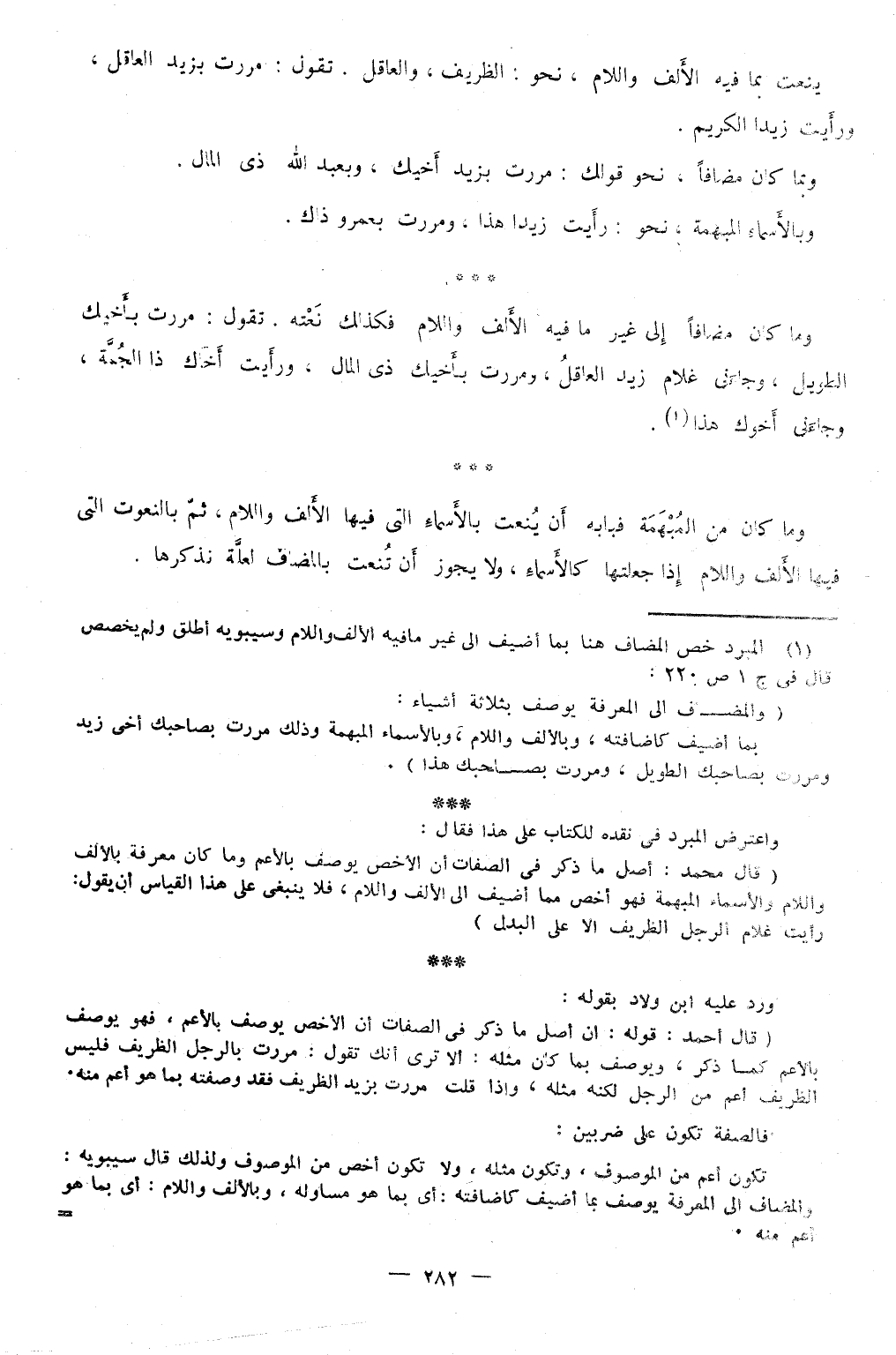 وَمَا كَانَ من المبهمة فبابه أَن ينعَت بالأسماء الَّتِي فِيهَا الْألف وَاللَّام ثمَّ بالنعوت الَّتِي فِيهَا الْألف وَاللَّام إِذا جَعلتهَا كالأسماء وَلَا يجوز أَن تنْعَت بالمضاف لعِلَّة نذكرها