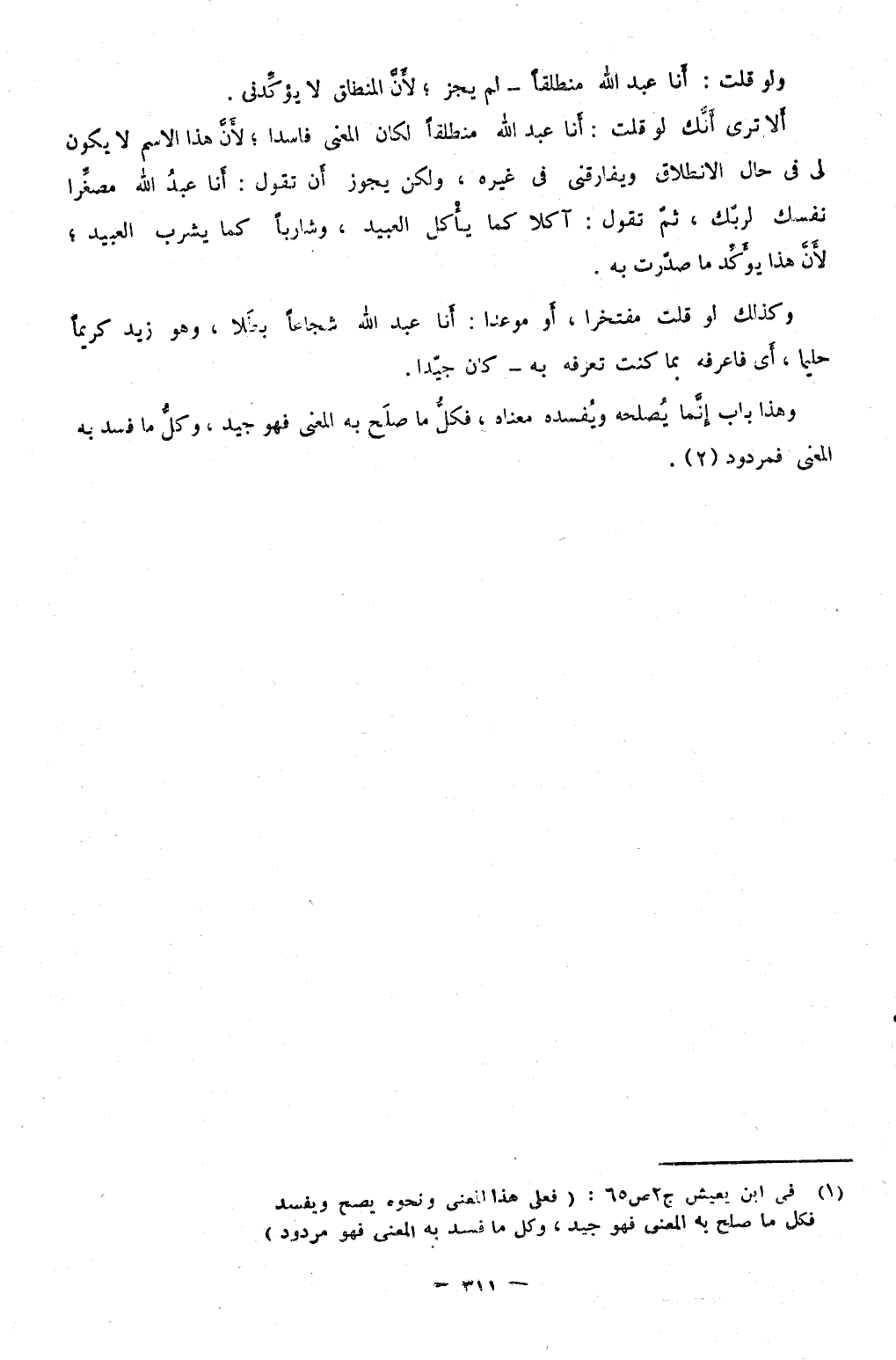 أَلا ترى أَنَّك لَو قلت أَنا عبد الله مُنْطَلقًا لَكَانَ الْمَعْنى فَاسِدا لِأَن هَذَا الِاسْم لَا يكون لي فِي حَال الانطلاق ويفارقني فِي غَيره وَلَكِن يجوز أَن تَقول أَنا عبد الله مُصَغرًا نَفسك لِرَبِّك ثمَّ تَقول آكلا كَمَا يَأْكُل العبيد وشاربا كَمَا يشرب العبيد لِأَن هَذَا يُؤَكد مَا صدرت بِهِ