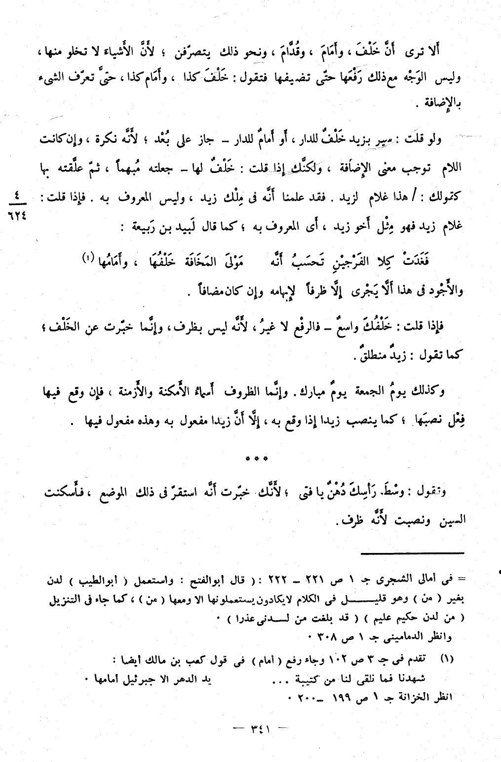 أَلا ترى أَن خلف وأمام وَقُدَّام وَنَحْو ذَلِك يتصرفن لِأَن الْأَشْيَاء لَا تَخْلُو مِنْهَا وَلَيْسَ الْوَجْه مَعَ ذَلِك رَفعهَا حَتَّى تضيفها فَتَقول خلف كَذَا وأمام كَذَا حَتَّى تعرف الشَّيْء بِالْإِضَافَة