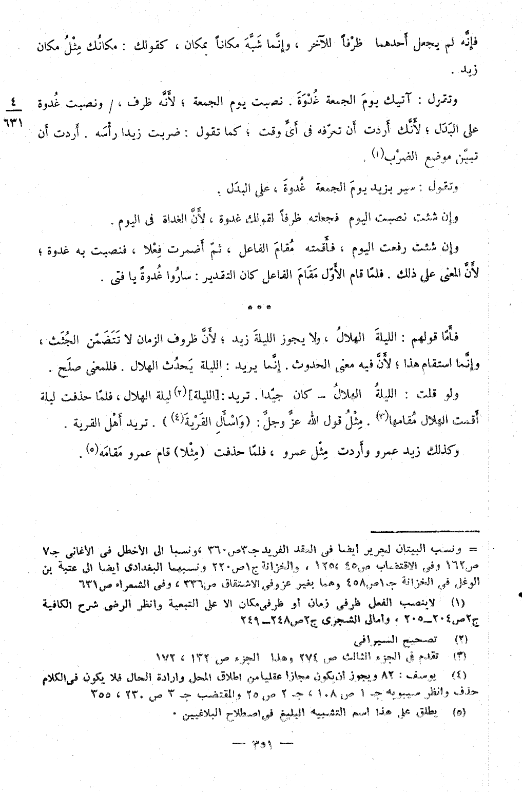 وَتقول آتِيك يَوْم الْجُمُعَة غدْوَة نصبت يَوْم الْجُمُعَة لِأَنَّهُ ظرف ونصبت غدْوَة على الْبَدَل لِأَنَّك أردْت أَن تعرفه فِي أَي وَقت كَمَا تَقول ضربت زيدا رَأسه أردْت أَن تبين مَوضِع الضَّرْب