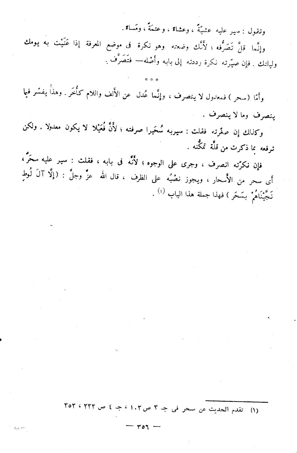 فَإِن نكرته انْصَرف وَجرى على الْوُجُوه لِأَنَّهُ فِي بَابه فَقلت سير عَلَيْهِ سحر أَي سحر من الأسحار وَيجوز نَصبه على الظّرْف قَالَ الله عز وَجل {إِلَّا آل لوط نجيناهم بِسحر} فَهَذَا جملَة هَذَا الْبَاب