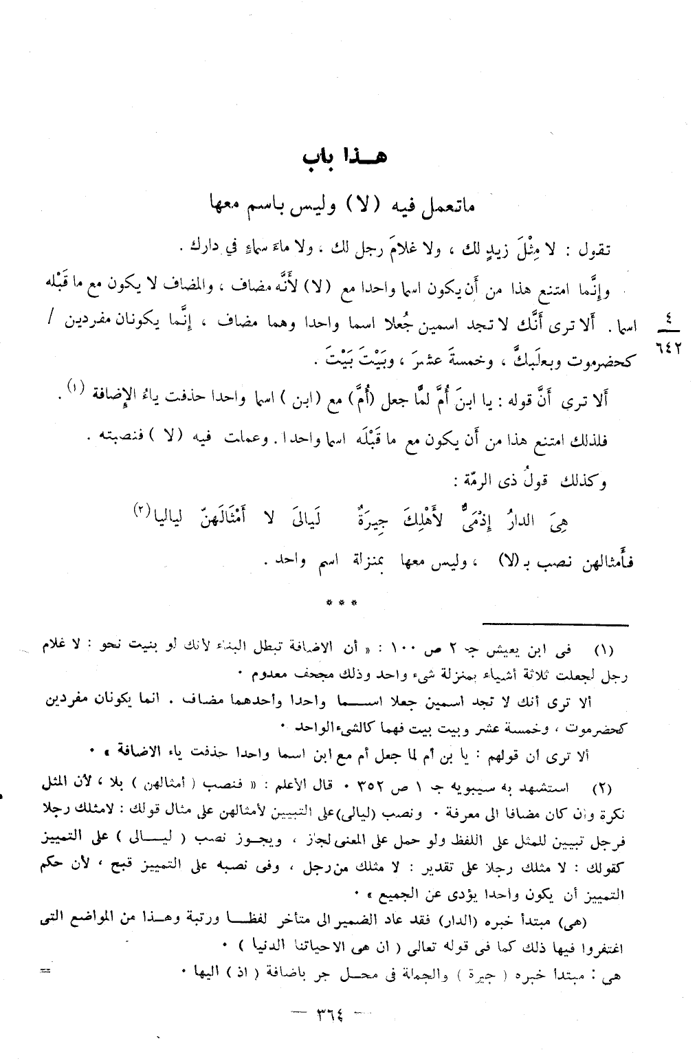 وَإِنَّمَا امْتنع هَذَا من أَن يكون اسْما وَاحِدًا مَعَ لَا لِأَنَّهُ مُضَاف والمضاف لَا يكون مَعَ مَا قبله اسْما أَلا ترى أَنَّك لَا تَجِد اسْمَيْنِ جعلا اسْما وَاحِدًا وهما مُضَاف إِنَّمَا يكونَانِ مفردين كحضرموت وبعلبك وَخَمْسَة عشر وَبَيت بَيت