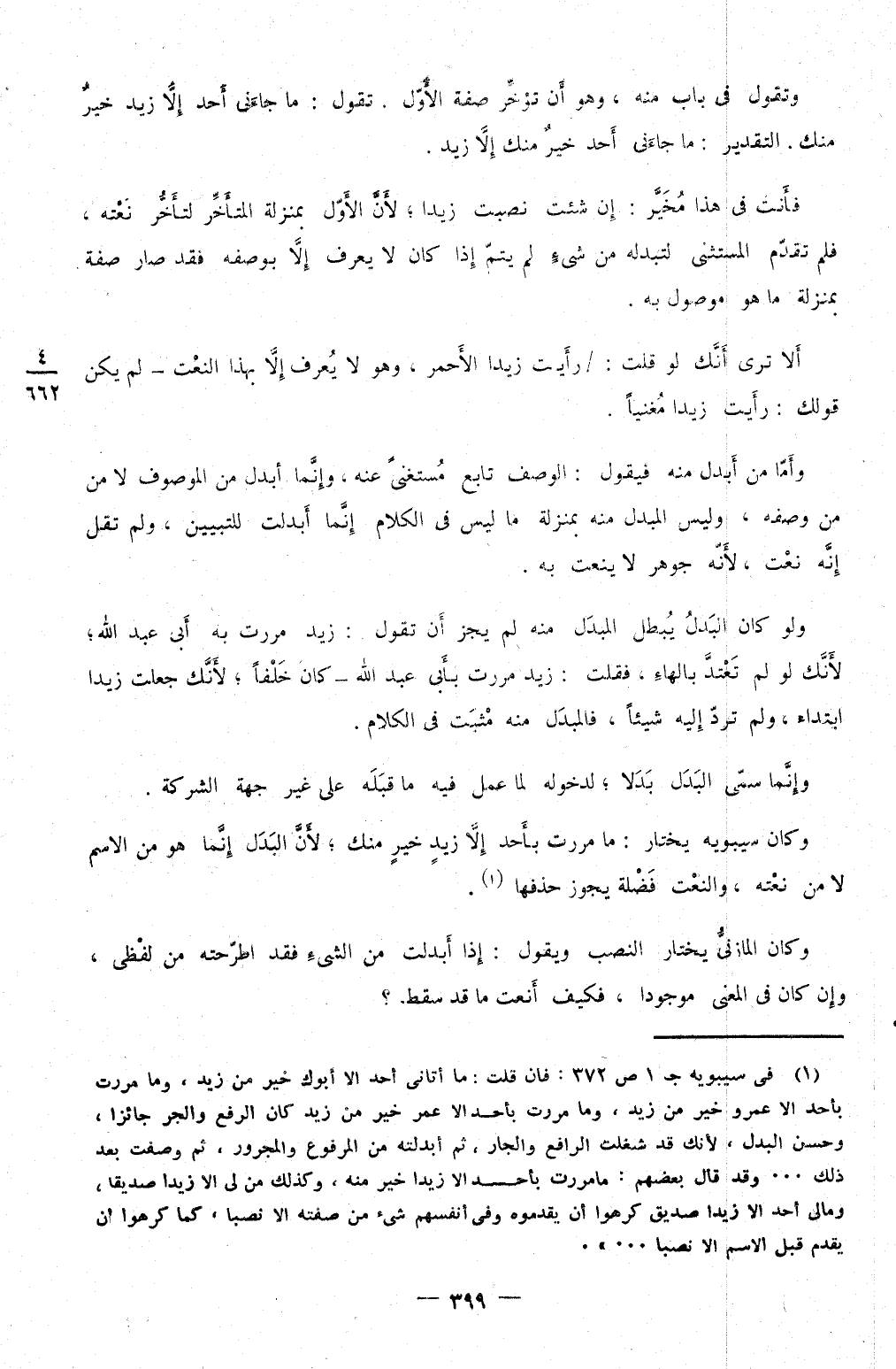 وَكَانَ سِيبَوَيْهٍ يخْتَار مَا مَرَرْت بِأحد إِلَّا زيد خير مِنْك لِأَن الْبَدَل إِنَّمَا هُوَ من الِاسْم لَا من نَعته والنعت فضلَة يجوز حذفهَا