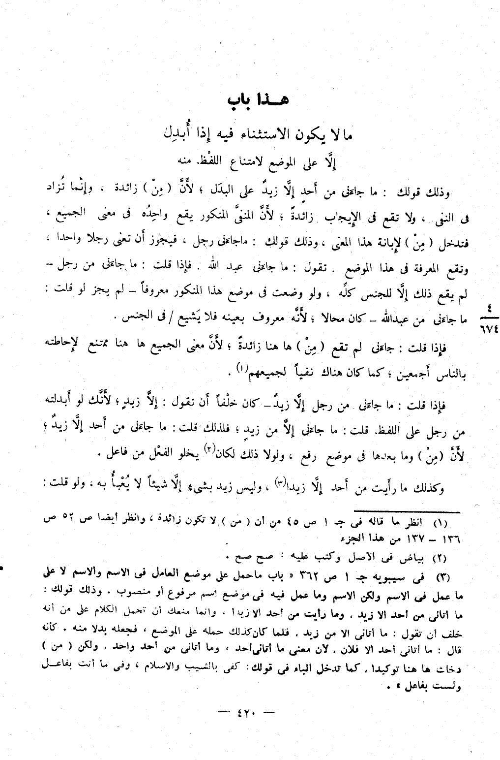 وَذَلِكَ قَوْلك ماجاءني من أحد إِلَّا زيد على الْبَدَل لِأَن من زَائِدَة وَإِنَّمَا تزاد فِي النَّفْي وَلَا تقع فِي الْإِيجَاب زَائِدَة لِأَن الْمَنْفِيّ المنكور يَقع واحده فِي معنى الْجَمِيع فَتدخل من لإبانة هَذَا الْمَعْنى وَذَلِكَ قَوْلك مَا جَاءَنِي رجل فَيجوز أَن تَعْنِي رجلا وَاحِدًا وَتَقَع الْمعرفَة فِي هَذَا الْموضع تَقول مَا جَاءَنِي عبد الله فَإِذا قلت مَا جَاءَنِي من رجل لم يَقع ذَلِك إِلَّا للْجِنْس كُله وَلَو وضعت فِي مَوضِع هَذَا المنكور مَعْرُوفا لم يجز لَو قلت مَا جَاءَنِي من عبد الله كَانَ محالا لِأَنَّهُ مَعْرُوف بِعَيْنِه فَلَا يشيع فِي الْجِنْس