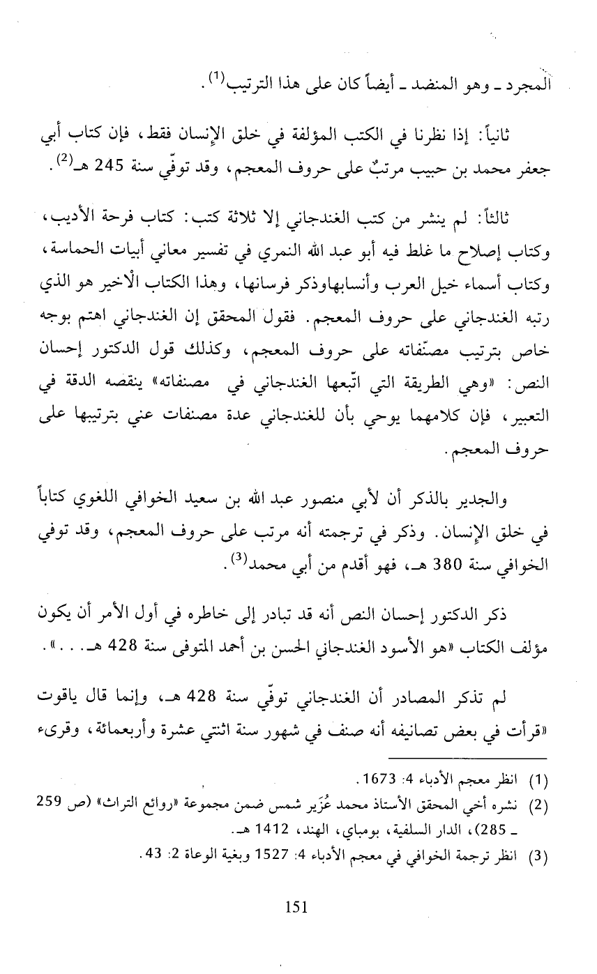 ثانيًا: إذا نظرنا في الكتب المؤلفة في خلق الإنسان فقط، فإن كتاب أبي جعفر محمد بن حبيب مرتبٌ على حروف المعجم، وقد توفّي سنة 245 هـ (2).