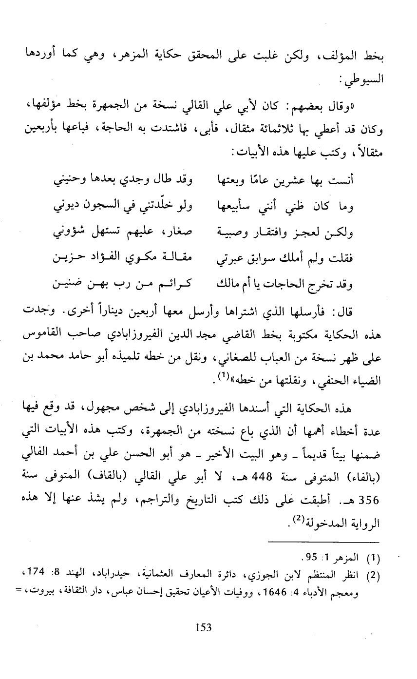 "وقال بعضهم: كان لأبي علي القالي نسخة من الجمهرة بخط مؤلفها، وكان قد أعطي بها ثلاثمائة مثقال، فأبى، فاشتدت به الحاجة، فباعها بأربعين مثقالًا، وكتب عليها هذه الأبيات: