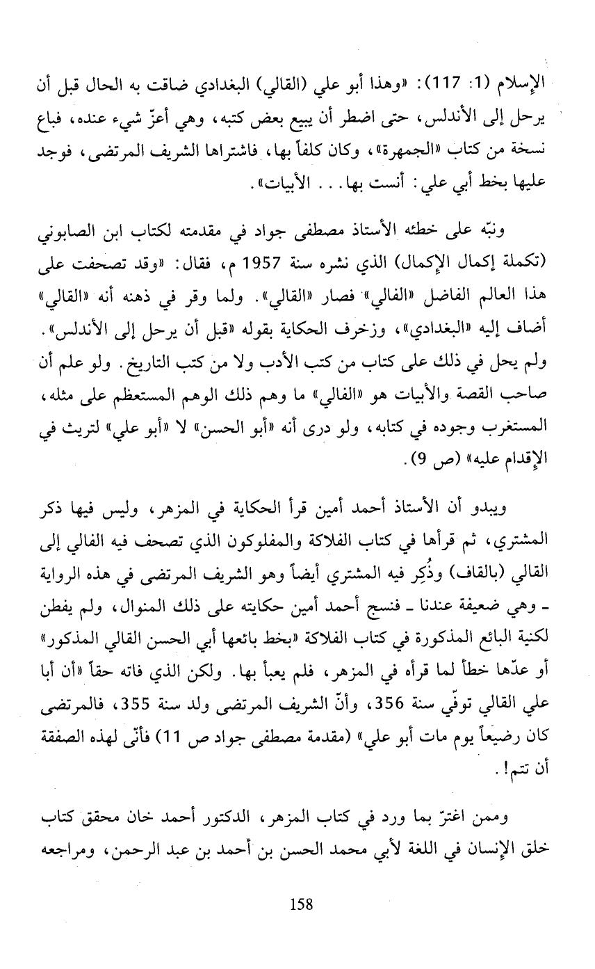 ويبدو أن الأستاذ أحمد أمين قرأ الحكاية في المزهر، وليس فيها ذكر المشتري، ثم قرأها في كتاب الفلاكة والمفلوكون الذي تصحف فيه الفالي إلى القالي (بالقاف) وذكر فيه المشتري أيضًا وهو الشريف المرتضى في هذه الرواية - وهي ضعيفة عندنا - فنسج أحمد أمين حكايته على ذلك المنوال، ولم يفطن لكنية البائع المذكورة في كتاب الفلاكة "بخط بائعها أبي الحسن القالي المذكور" أو عدّها خطأ لما قرأه في المزهر، فلم يعبأ بها. ولكن الذي فاته حقًا "أن أبا علي القالي توفي سنة 356، وأن الشريف المرتضى ولد سنة 355، فالمرتضى كان رضيعًا يوم مات أبو علي" (مقدمة مصطفى جواد ص 11) فأنّى لهذه الصفقة أن تتم! .