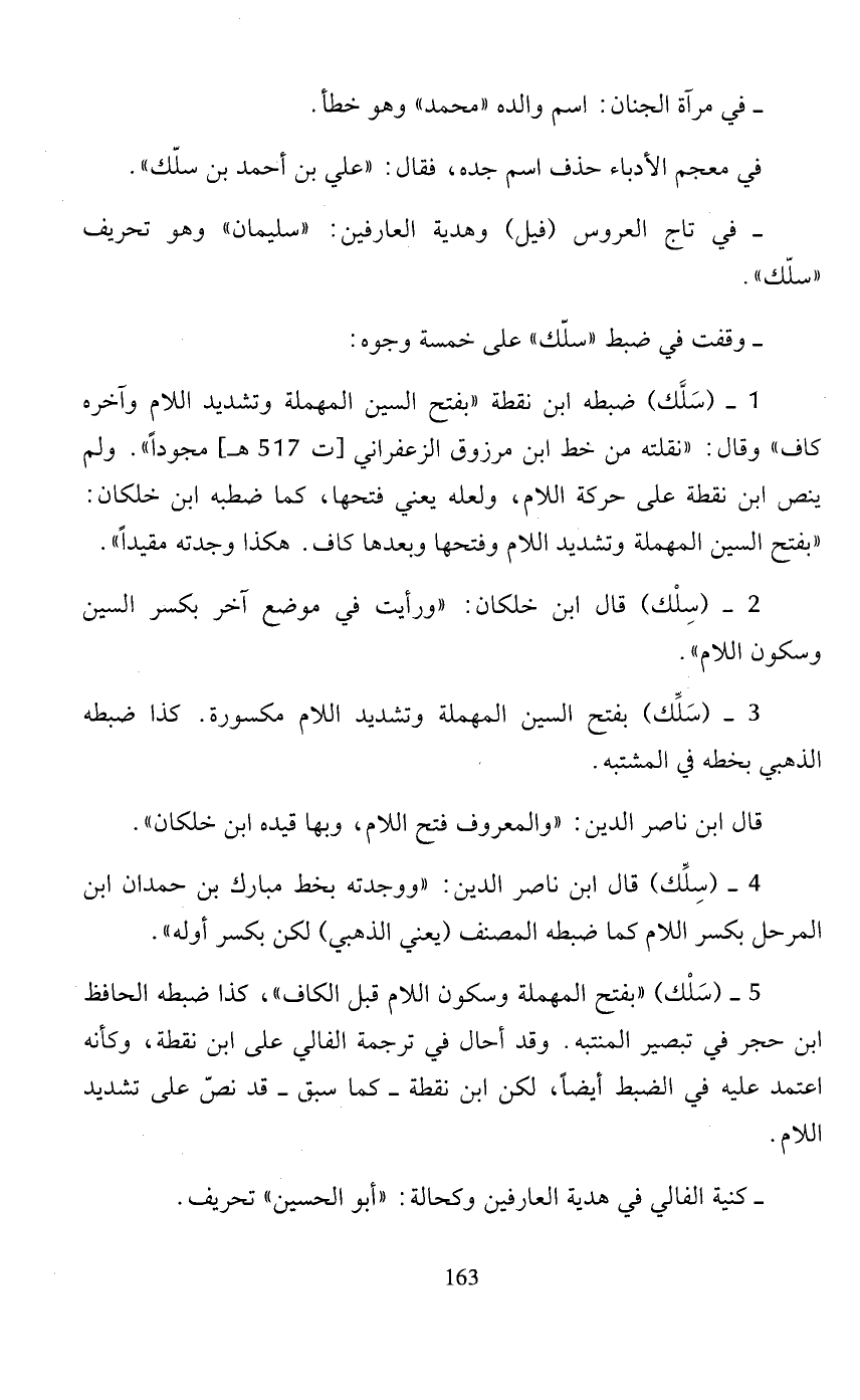 5 - (سلك) "بفتح المهملة وسكون اللام قبل الكاف)، كذا ضبطه الحافظ ابن حجر في تبصير المنتبه. وقد أحال في ترجمة الفالي على ابن نقطة، وكأنه اعتمد عليه في الضبط أيضًا، لكن ابن نقطة - كما سبق - قد نصّ على تشديد اللام.