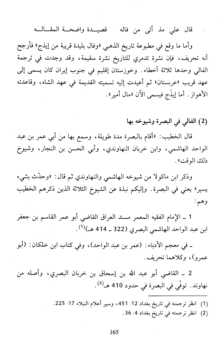 وأما ما وقع في مطبوعة تاريخ الذهبي "وفال بليدة قريبة من إيذج" فأرجح أنه تحريف، فإن نشرة تدمري للتاريخ نشرة سقيمة، وقد وجدت في ترجمة الفالي وحدها ثلاثة أخطاء. وخوزستان إقليم في جنوب إيران كان يسمى إلى عهد قريب "عربستان" ثم أعيدت إليه تسميته القديمة في عهد الشاه، وقاعدته الأهواز. أما إيذج فيسمى الآن "مال أمير".