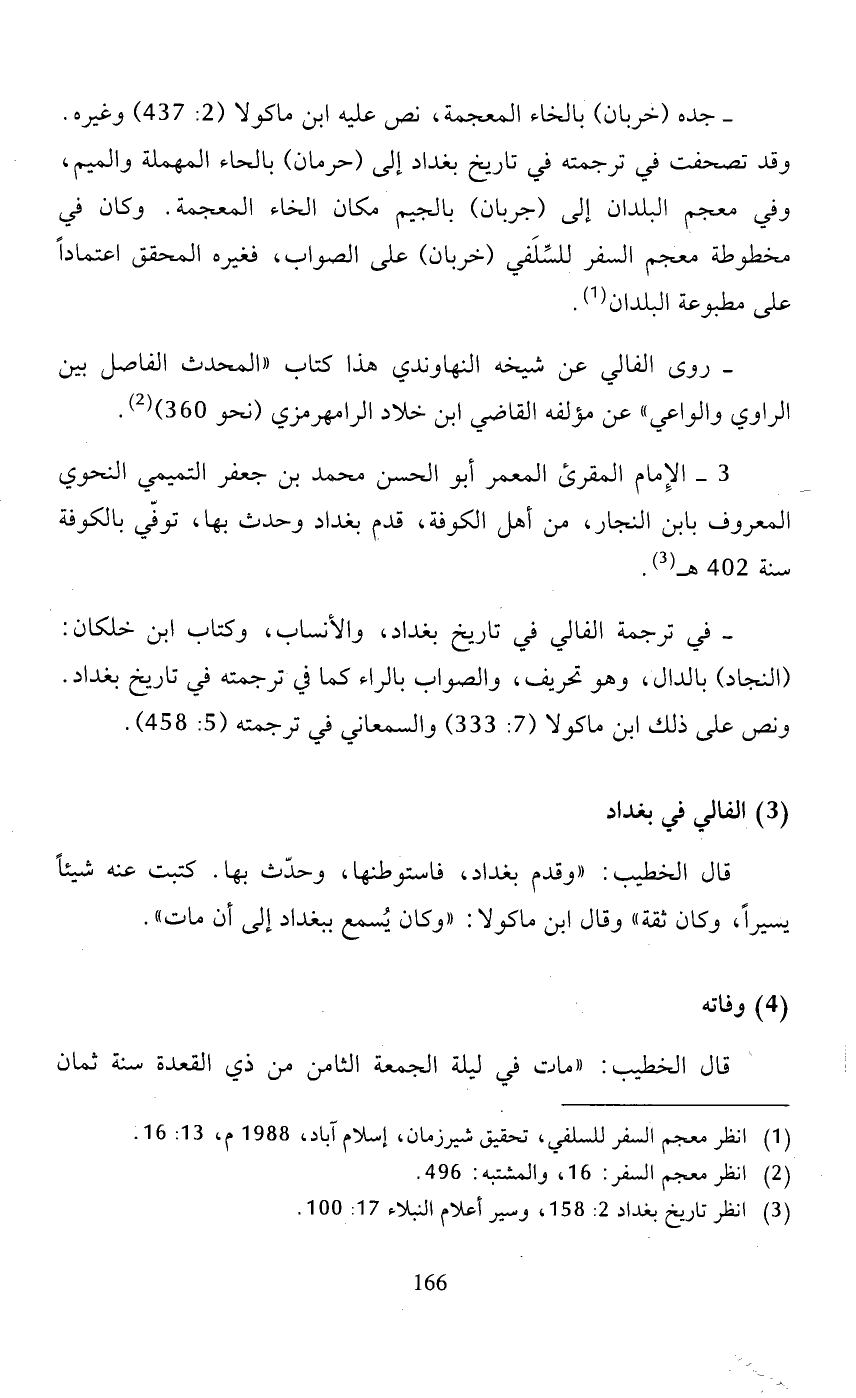 - في ترجمة الفالي في تاريخ بغداد، والأنساب، وكتاب ابن خلكان: (النجاد) بالدال، وهو تحريف، والصواب بالراء كما في ترجمته في تاريخ بغداد. ونص على ذلك ابن ماكولا (7: 333) والسمعاني في ترجمته (5: 458).