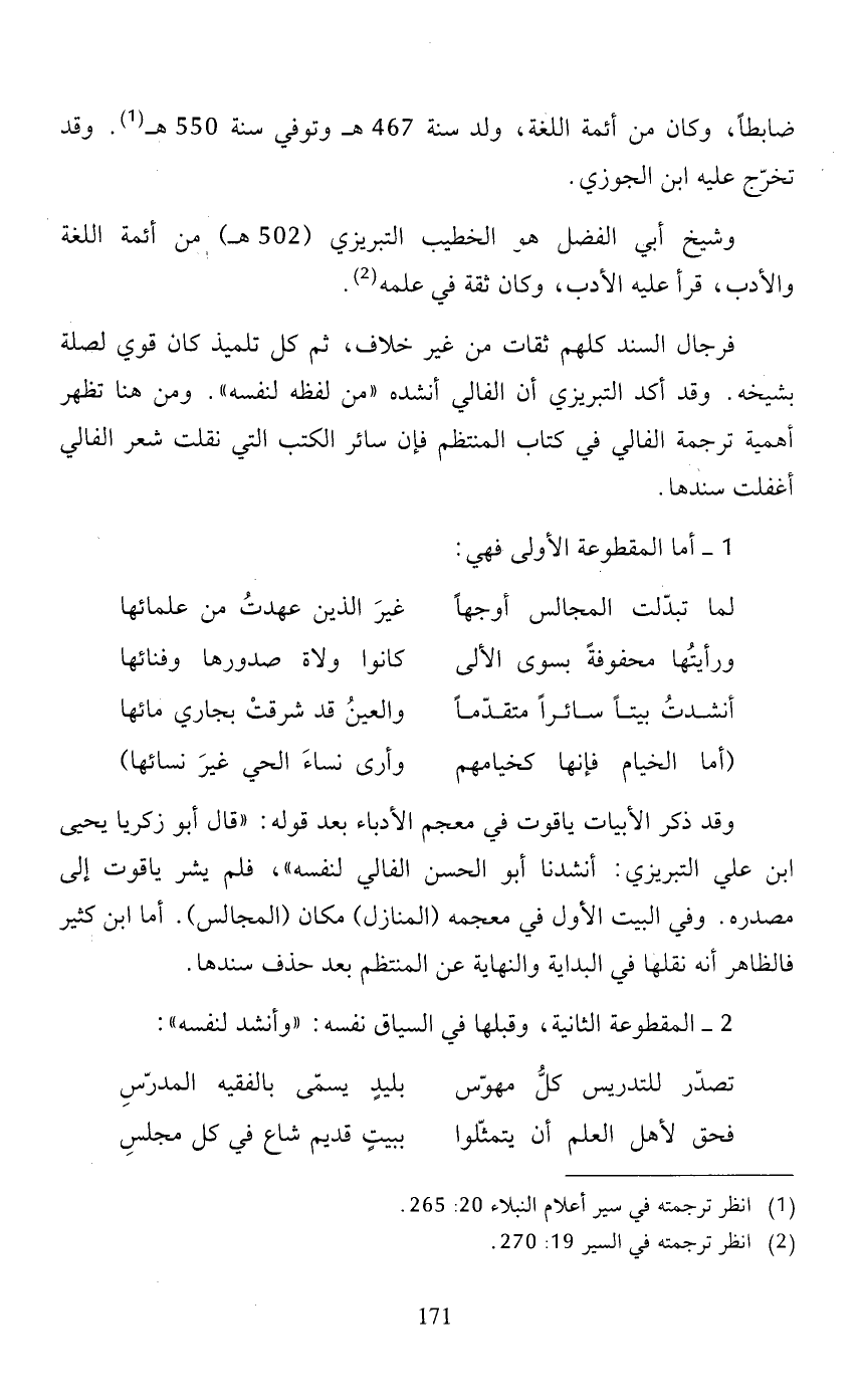 وقد ذكر الأبيات ياقوت في معجم الأدباء بعد قوله: "قال أبو زكريا يحيى ابن علي التبريزي: أنشدنا أبو الحسن الفالي لنفسه"، فلم يشر ياقوت إلى مصدره. وفي البيت الأول في معجمه (المنازل) مكان (المجالس). أما ابن كثير فالظاهر أنه نقلها في البداية والنهاية عن المتنظم بعد حذف سندها.