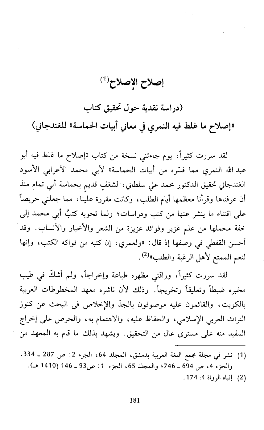 (دراسة نقدية حول تحقيق كتاب "إصلاح ما غلط فيه النمري في معاني أبيات الحماسة" للغندجاني)