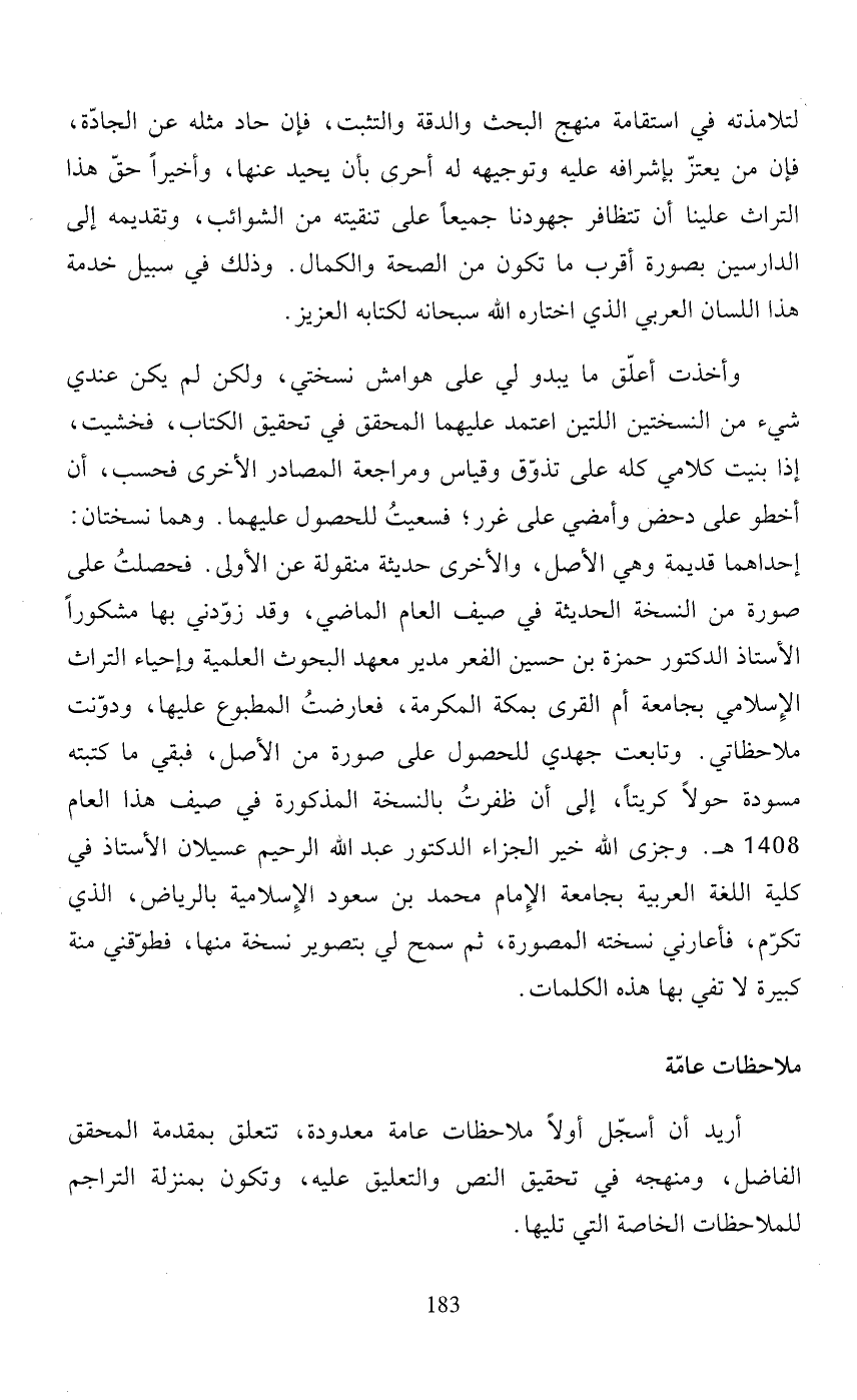 أريد أن أسجّل أولًا ملاحظات عامة معدودة، تتعلق بمقدمة المحقق الفاضل، ومنهجه في تحقيق النص والتعليق عليه، وتكون بمنزلة التراجم للملاحظات الخاصة التي تليها.