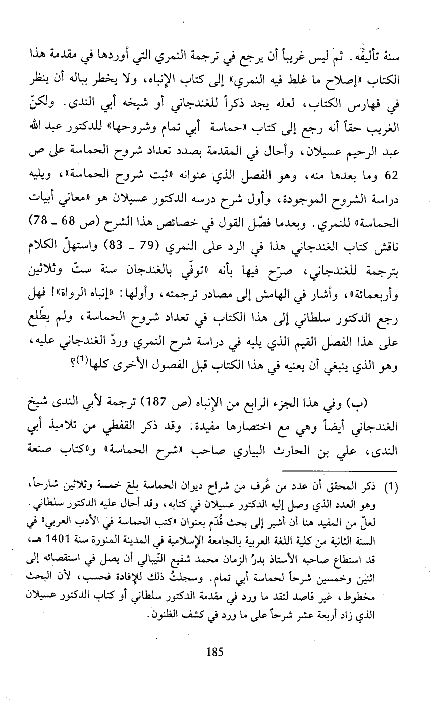 سنة تأليفه. ثم ليس غريبًا أن يرجع في ترجمة النمري التي أوردها في مقدمة هذا الكتاب "إصلاح ما غلط فيه النمري" إلى كتاب الإنباه، ولا يخطر بباله أن ينظر في فهارس الكتاب، لعله يجد ذكرًا للغندجاني أو شيخه أبي الندى. ولكنّ الغريب حقًا أنه رجع إلى كتاب "حماسة أبي تمام وشروحها" للدكتور عبد الله عبد الرحيم عسيلان، وأحال في المقدمة بصدد تعداد شروح الحماسة على ص 62 وما بعدها منه، وهو الفصل الذي عنوانه "ثبت شروح الحماسة"، ويليه دراسة الشروح الموجودة، وأول شرح درسه الدكتور عسيلان هو "معاني أبيات الحماسة" للنمري. وبعدما فصّل القول في خصائص هذا الشرح (ص 68 - 78) ناقش كتاب الغندجاني هذا في الرد على النمري (79 - 83) واستهلّ الكلام بترجمة للغندجاني، صرّح فيها بأنه "توفّي بالغندجان سنة ستّ وثلاثين وأربعمائة"، وأشار في الهامش إلى مصادر ترجمته، وأولها: "إنباه الرواة"! فهل رجع الدكتور سلطاني إلى هذا الكتاب في تعداد شروح الحماسة، ولم يطّلع على هذا الفصل القيم الذي يليه في دراسة شرح النمري وردّ الغندجاني عليه، وهو الذي ينبغي أن يعنيه في هذا الكتاب قبل الفصول الأخرى كلها (1)؟