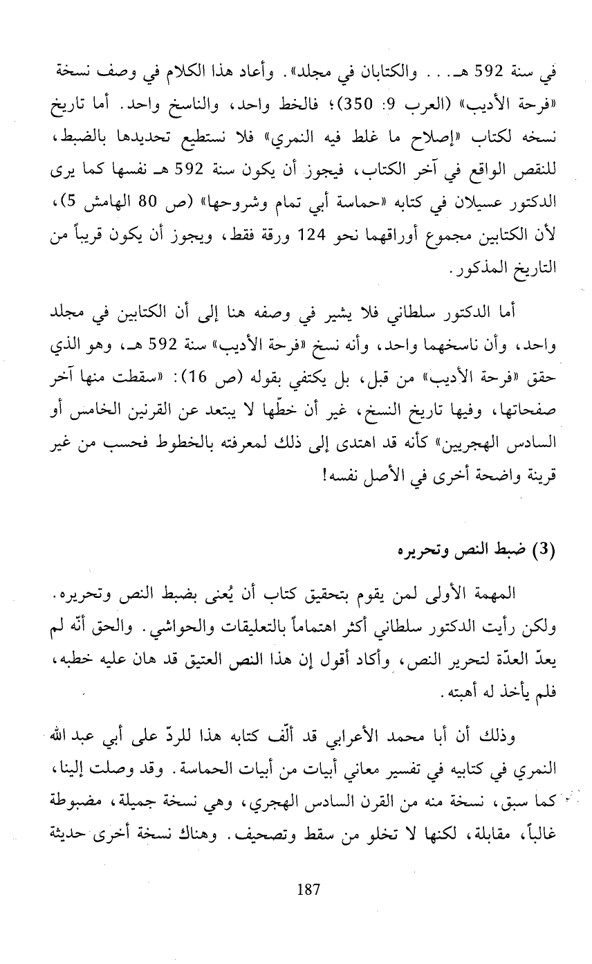 في سنة 592 هـ ... والكتابان في مجلد". وأعاد هذا الكلام في وصف نسخة "فرحة الأديب" (العرب 9: 350)؛ فالخط واحد، والناسخ واحد. أما تاريخ نسخه لكتاب "إصلاح ما غلط فيه النمري" فلا نستطيع تحديدها بالضبط، للنقص الواقع في آخر الكتاب، فيجوز أن يكون سنة 592 هـ نفسها كما يرى الدكتور عسيلان في كتابه "حماسة أبي تمام وشروحها" (ص 80 الهامش 5)، لأن الكتابين مجموع أوراقهما نحو 124 ورقة فقط، ويجوز أن يكون قريبًا من التاريخ المذكور.