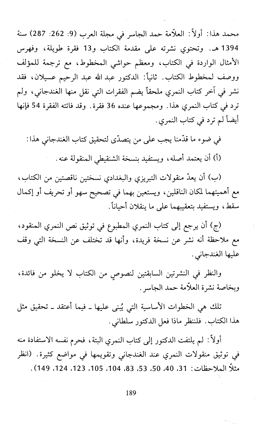 (ج) أن يرجع إلى كتاب النمري المطبوع في توثيق نص النمري المنقود، مع ملاحظة أنه نشر عن نسخة فريدة، وأنها قد تختلف عن النسخة التي وقف عليها الغندجاني.