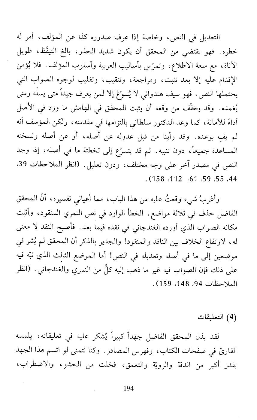 التعديل في النص، وخاصة إذا عرف صدوره كذا عن المؤلف، أمر له خطره. فهو يقتضي من المحقق أن يكون شديد الحذر، بالغ التيقّظ، طويل الأناة، مع سعة الاطلاع، وتمرّس بأساليب العربية وأسلوب المؤلف. فلا يؤمن الإقدام عليه إلا بعد تثبت، ومراجعة، وتنقيب، وتقليب لوجوه الصواب التي يحتملها النص. فهو سيف هندواني لا يسوّغ إلا لمن يعرف جيدًا متى يسلّه ومتى يغمده. وقد يخفّف من وقعه أن يثبت المحقق في الهامش ما ورد في الأصل أداءً للأمانة، كما وعد الدكتور السلطاني بالتزامها في مقدمته، ولكن المؤسف أنه لم يفِ بوعده. وقد رأينا من قبل عدوله عن أصله، أو عن أصله ونسخته المساعدة جميعًا، دون تنبيه، ثم قد يتسرّع إلى تخطئة ما في أصله، إذا وجد النص في مصدر آخر على وجه مختلف، ودون تعليل. (انظر الملاحظات 39، 44، 55، 59، 61، 112، 158).