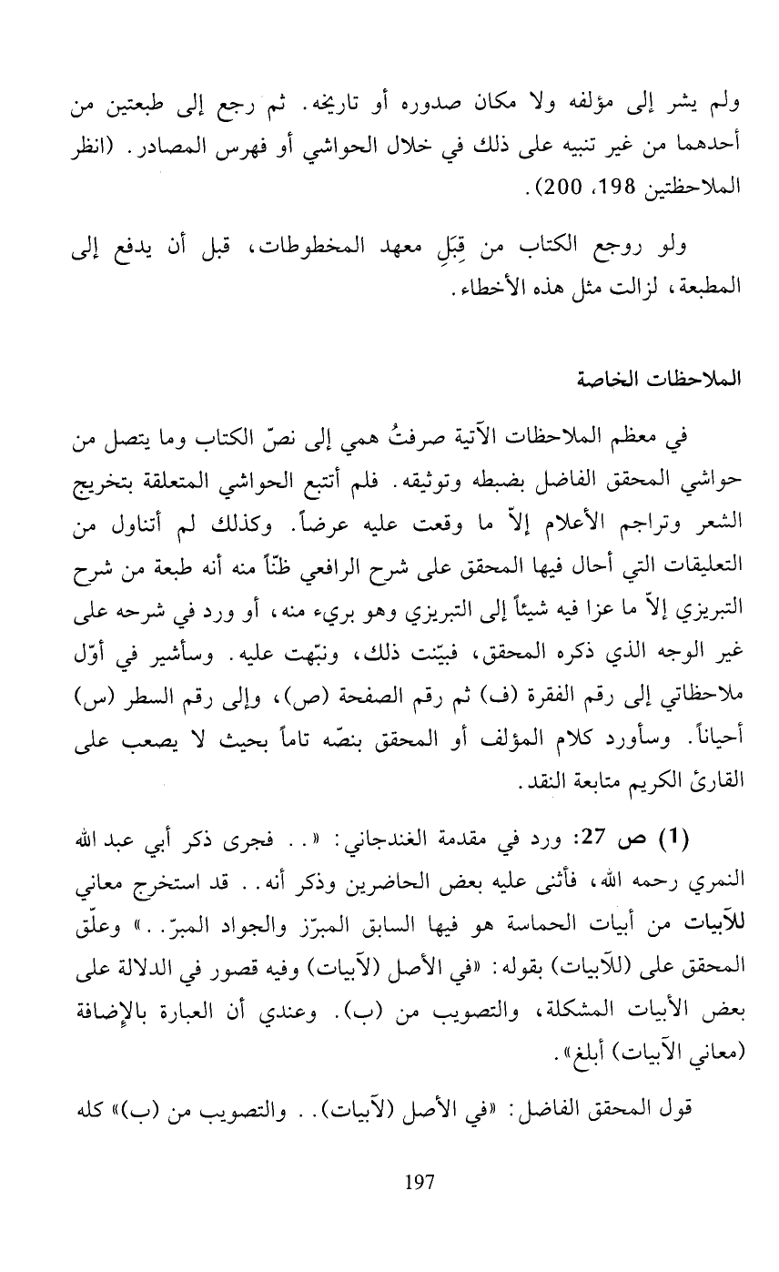 في معظم الملاحظات الآتية صرفت همي إلى نصّ الكتاب وما يتصل من حواشي المحقق الفاضل بضبطه وتوثيقه. فلم أتتبع الحواشي المتعلقة بتخريج الشعر وتراجم الأعلام إلاّ ما وقعت عليه عرضًا. وكذلك لم أتناول من التعليقات التي أحال فيها المحقق على شرح الرافعي ظنًّا منه أنه طبعة من شرح التبريزي إلاّ ما عزا فيه شيئًا إلى التبريزي وهو بريء منه، أو ورد في شرحه على غير الوجه الذي ذكره المحقق، فبيّنت ذلك، ونبّهت عليه. وسأشير في أوّل ملاحظاتي إلى رقم الفقرة (ف) ثم رقم الصفحة (ص)، وإلى رقم السطر (س) أحيانًا. وسأورد كلام المؤلف أو المحقق بنصّه تاماّ بحيث لا يصعب على القارئ الكريم متابعة النقد.