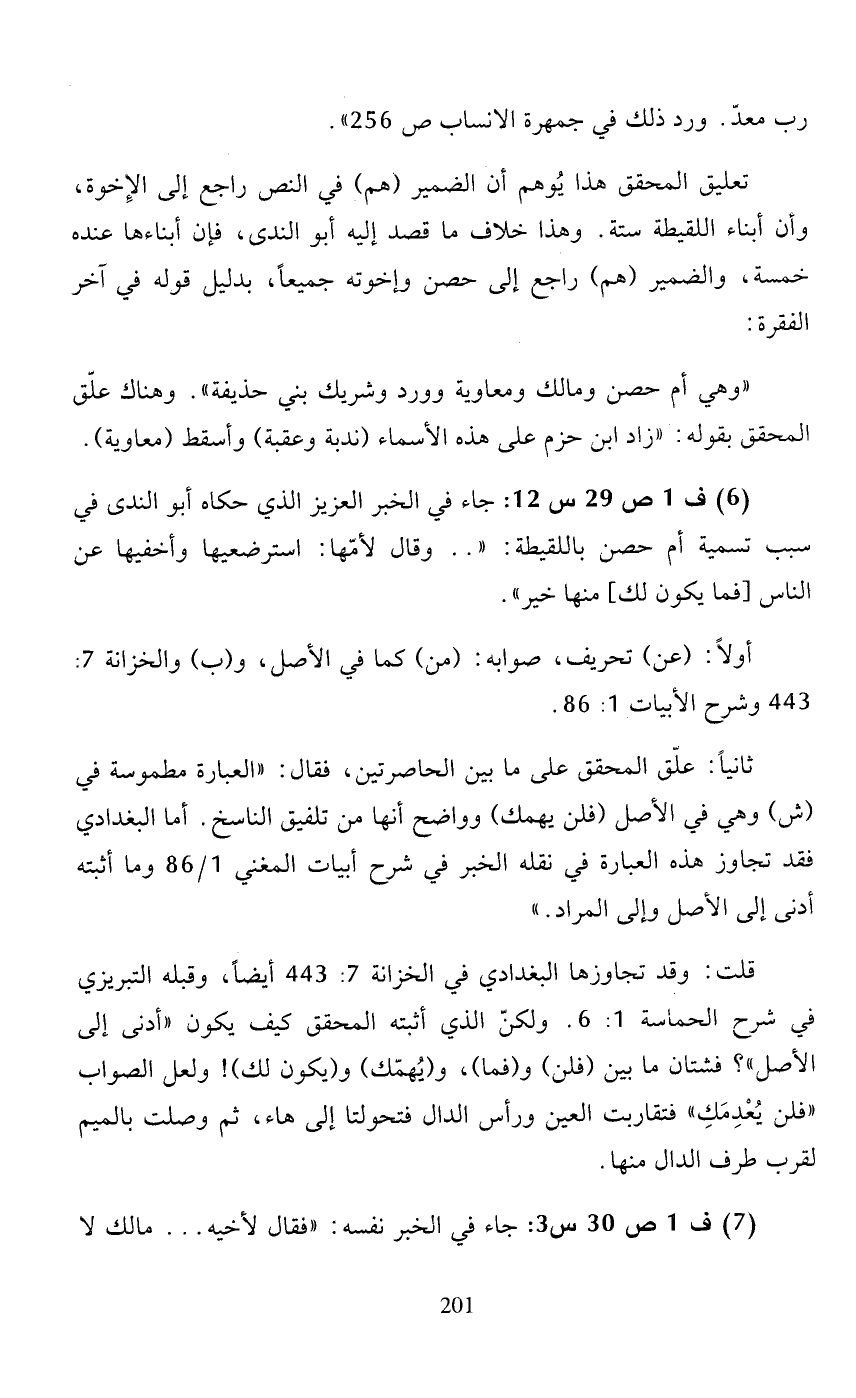 تعليق المحقق هذا يوهم أن الضمير (هم) في النص راجع إلى الإخوة، وأن أبناء اللقيطة ستة. وهذا خلاف ما قصد إليه أبو الندى، فإن أبناءها عنده خمسة، والضمير (هم) راجع إلى حصن وإخوته جميعًا، بدليل قوله في آخر الفقرة: